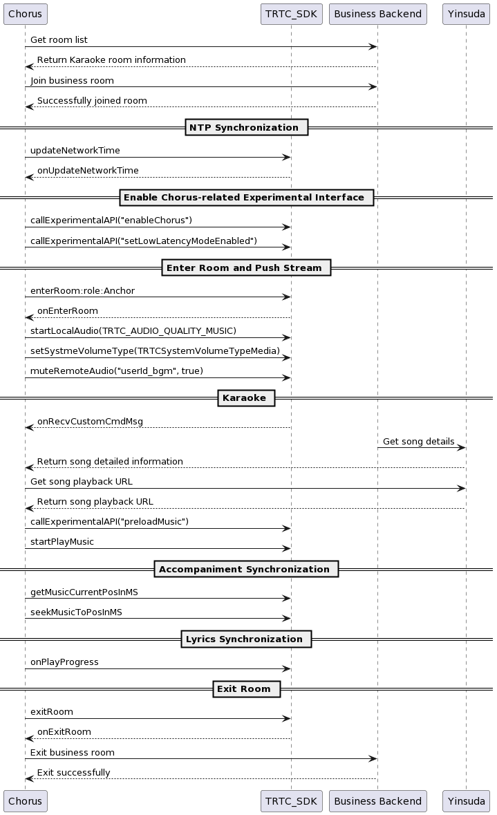 The room owner creates the Karaoke room, and users can choose to join the room they are interested in. After entering the room, users can go on the seat to participate in the interaction and have voice interaction with the room owner. Of course, users can also choose to go directly on the seat to participate in the chorus. These are two different Karaoke play modes. The overall business process of the online Karaoke scenario is shown in the figure below.