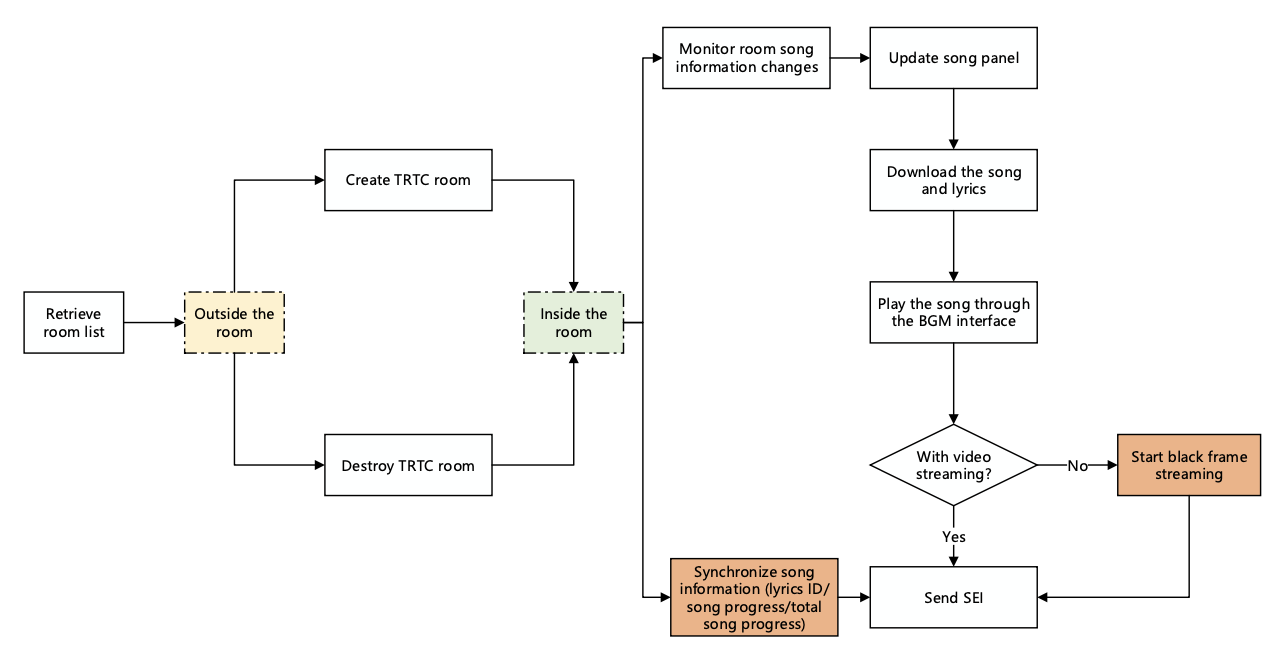 Depending on business needs, you can choose a real-time chorus solution for either pure audio or audio and video scenarios. If it is a pure audio scenario, black frames need to be added to send SEI messages for lyric synchronization.