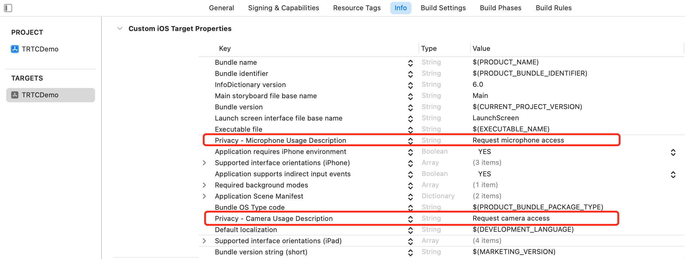 3. In Info.plist, add Privacy-Microphone Usage Description and Privacy-Camera Usage Description. Fill in appropriate prompts for microphone and camera permissions.