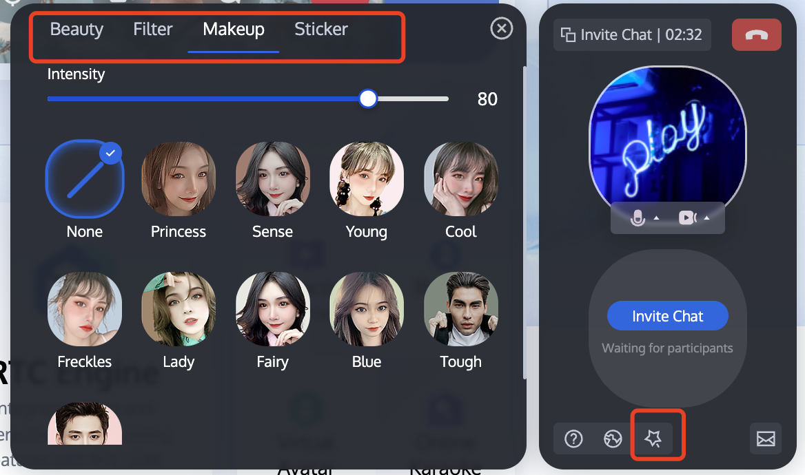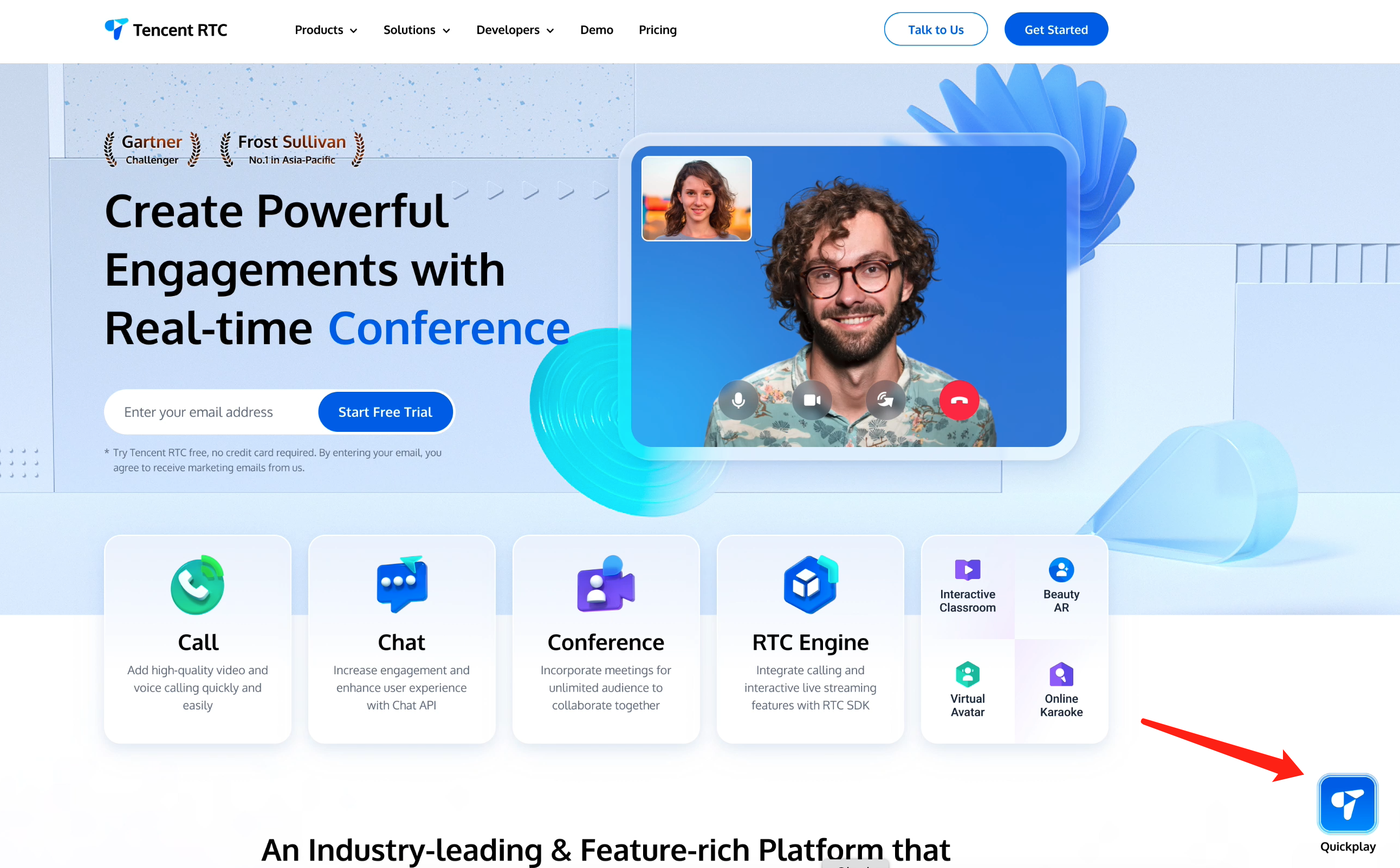 RTC Quickplay is a web-based real-time video call demo developed using the RTC Engine SDK and Beauty AR SDK. No registration is required - simply click "Create Room" to start experiencing audio and video calls instantly.