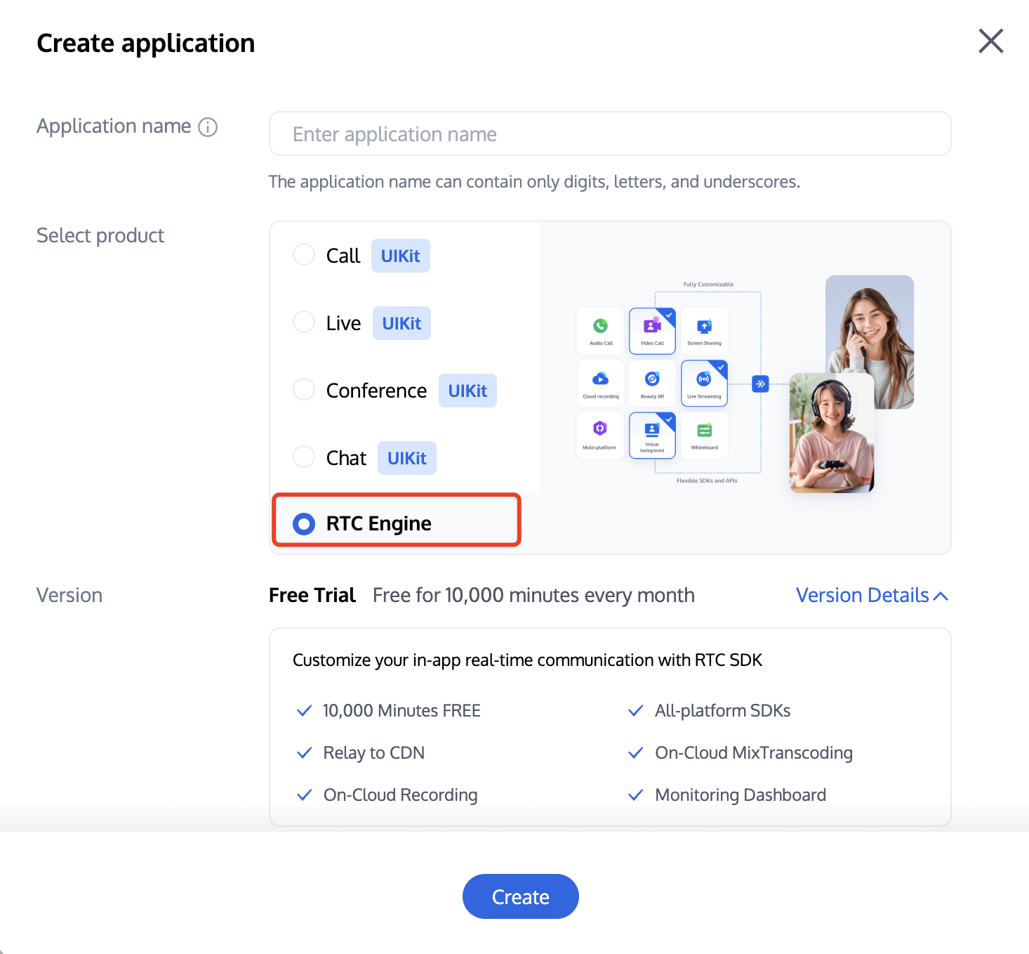 1. Log in to the TRTC console, click Create Application in the Applications section. 2. In the popup page, enter your application name, select RTC Engine, and then click Create.