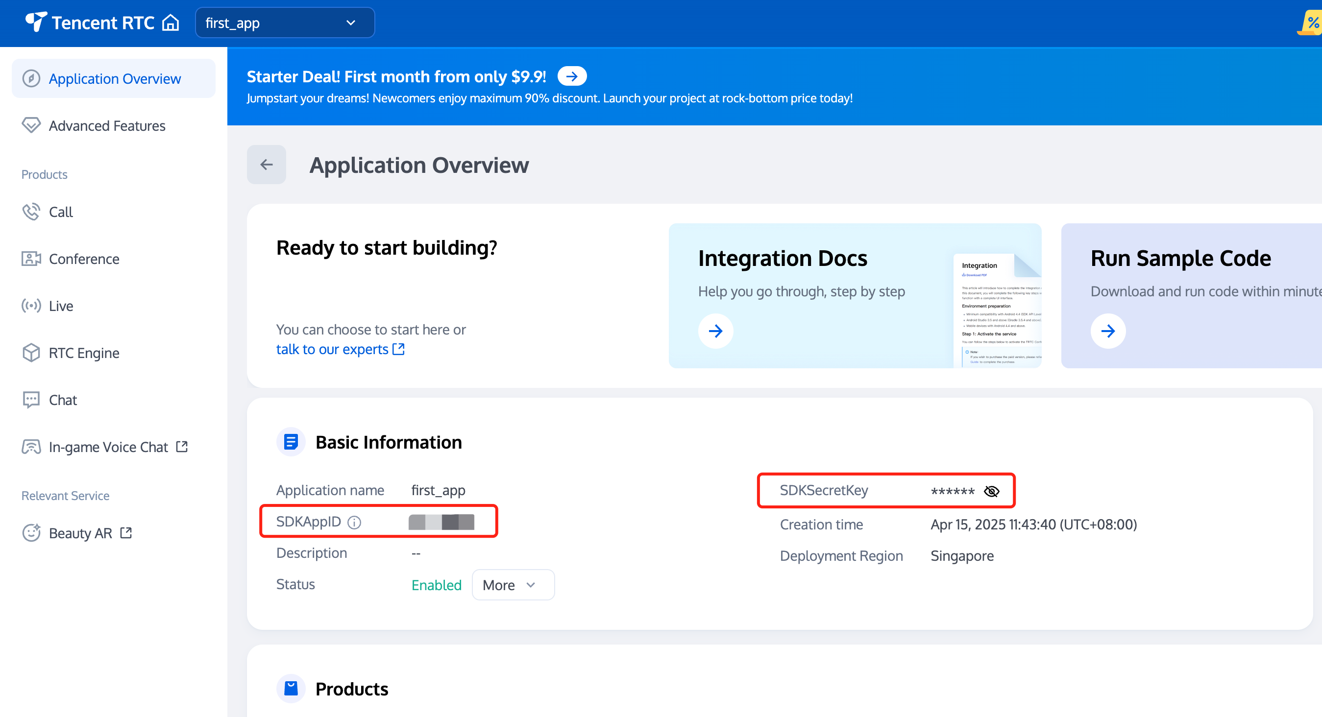 Step 2. Get your application's SDKAppId and SecretKey