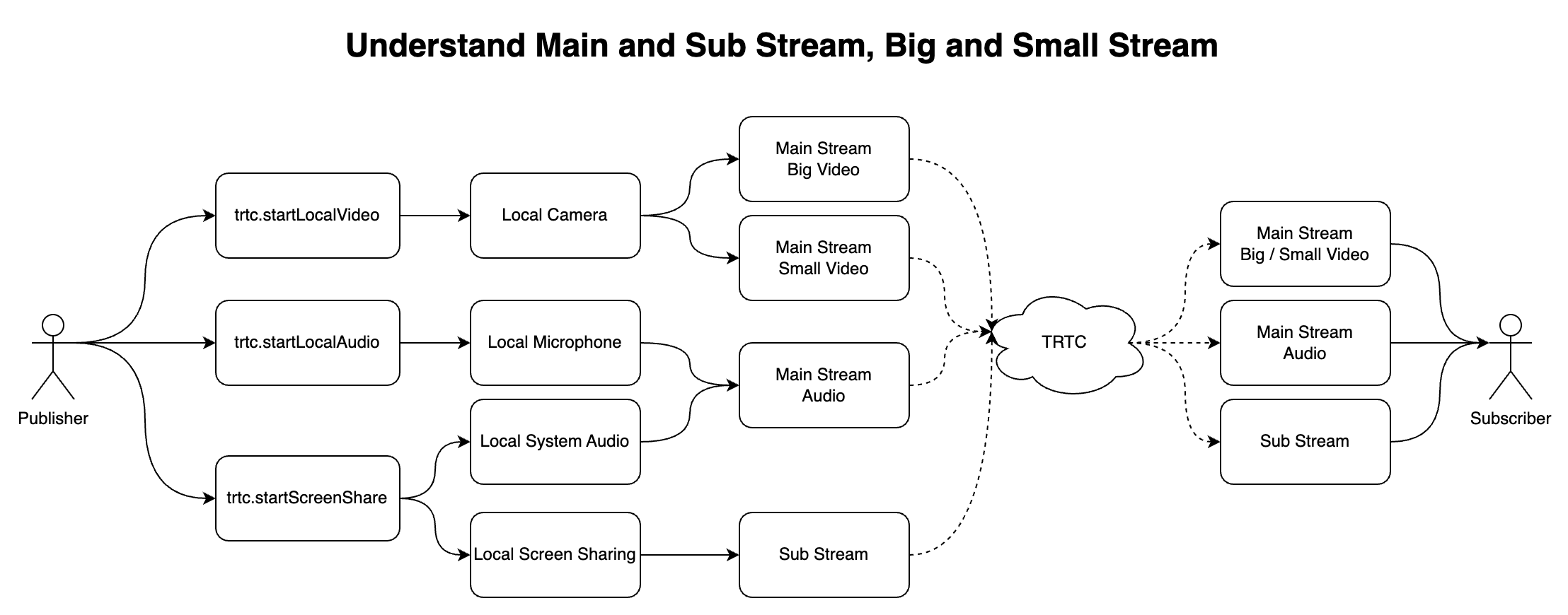 TRTC's video stream has a main stream and a sub stream. The main stream includes the big stream and the small stream, and the sub stream is generally used for screen sharing.