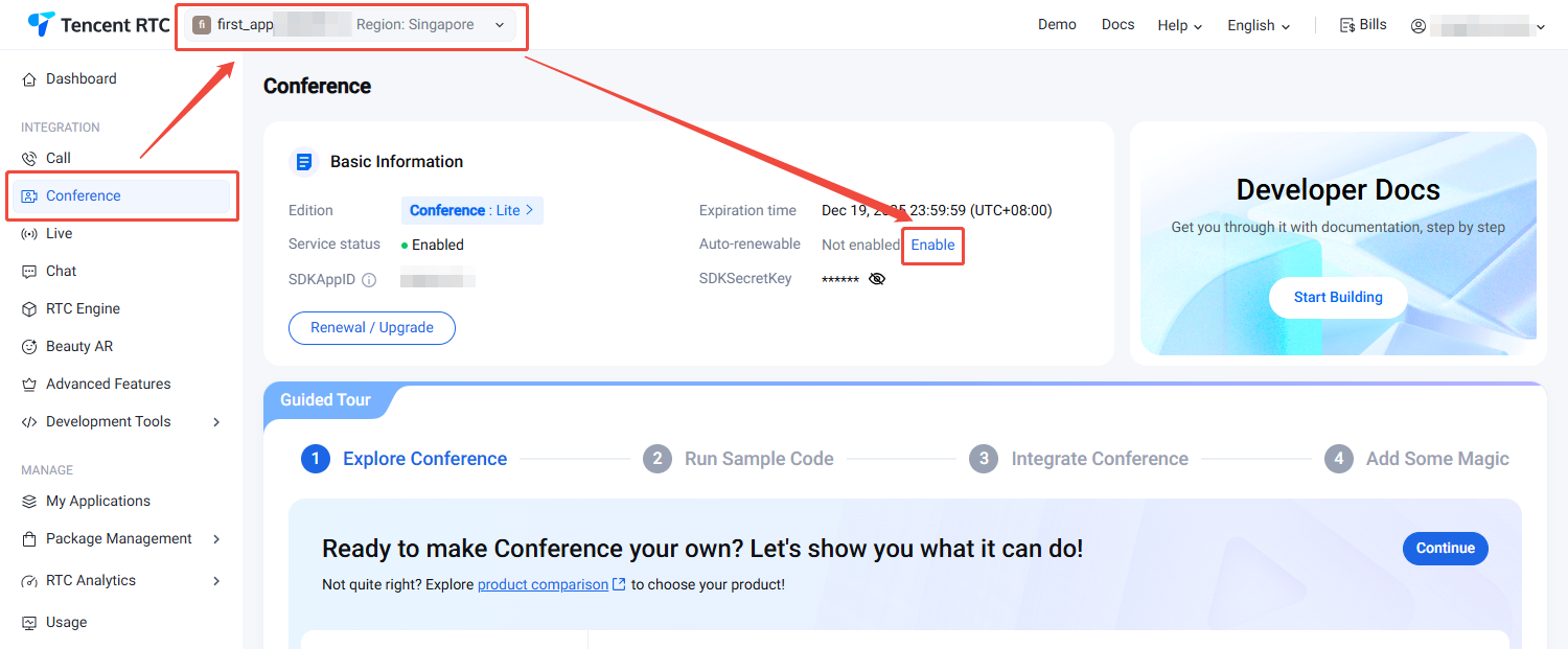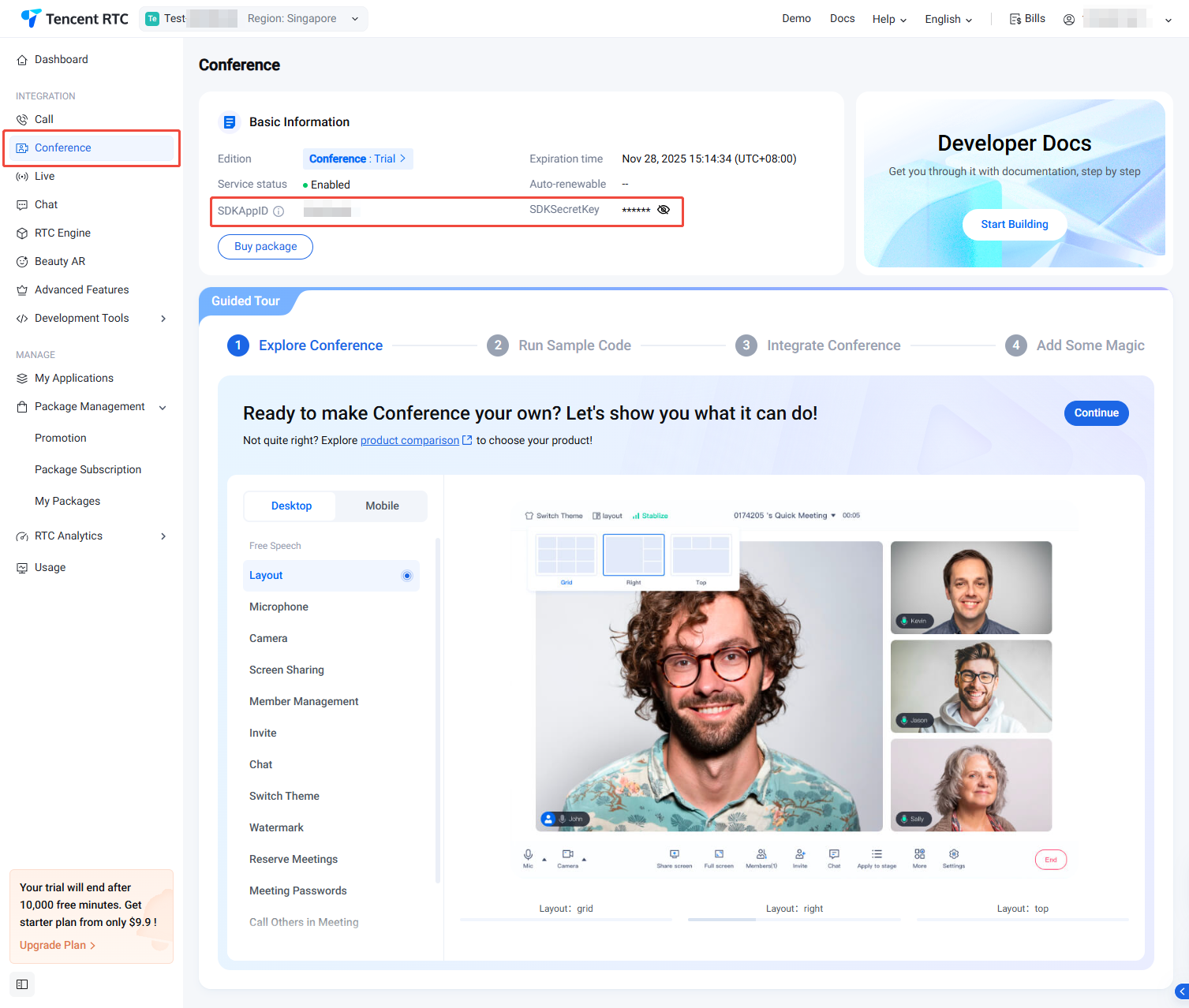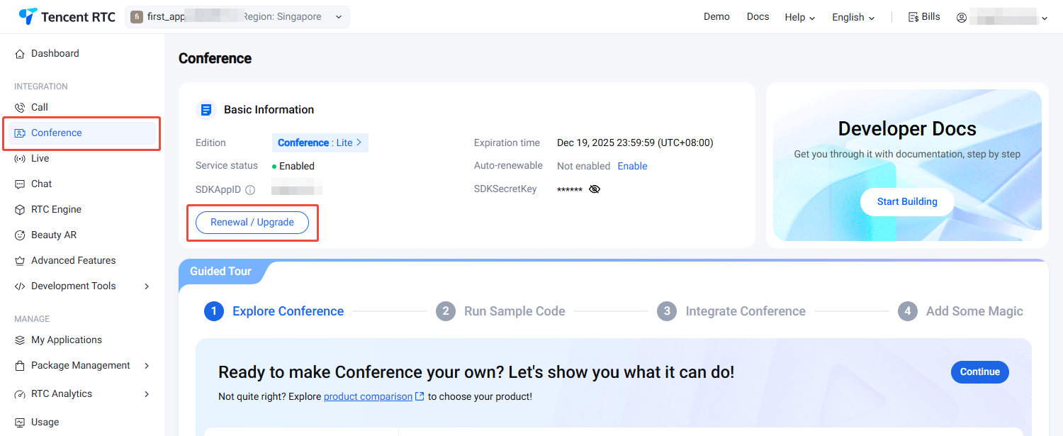 3. After the application has been created, you will automatically be taken to the Conference product details page. At this point, you have quickly created an application and successfully received the TRTC Conference (TUIRoomKit) trial version. You can view information on the current Conference Product Details Page or My Applications, and refer to the integration guide for integration. The SDKAppID and SDKSecretKey will be used in the integration guide. Purchasing the Official Editions