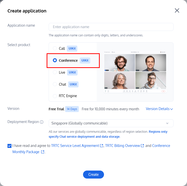 2. In the Create Pop-up Window, select Conference and enter the application name, choose the appropriate deployment region, and click Create.