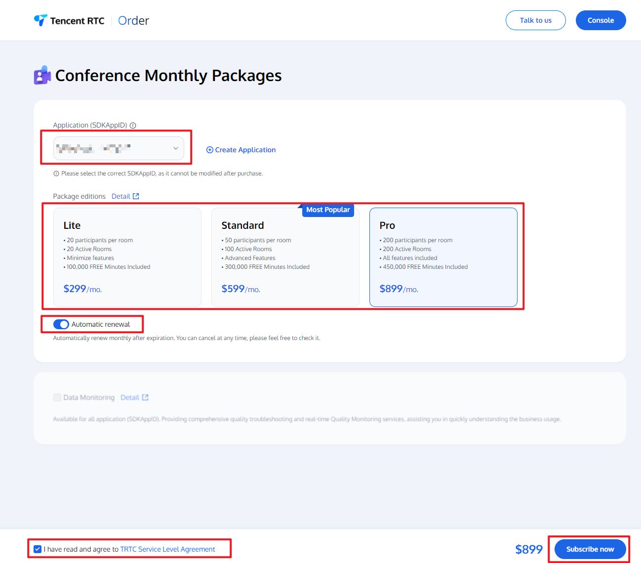 1. Visit the TRTC Conference Purchase page, select the Application (SDKAppID) and Conference Package you want to purchase. At the same time, we recommend you to enable Auto-renewal to avoid affecting business use. After Confirming purchase information and agreeing to the relevant agreement, check the agreement content and click Subscribe now. 2. Go to the order confirmation page to confirm product information. 3. Go to the payment page to complete the payment. After the purchase is completed, you can go to the TRTC Console to view application edition information, and refer to the Integration guide for integration. Renew the official edition
