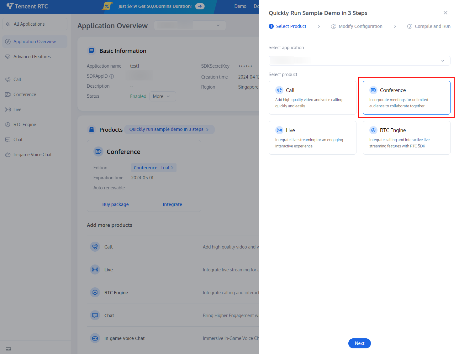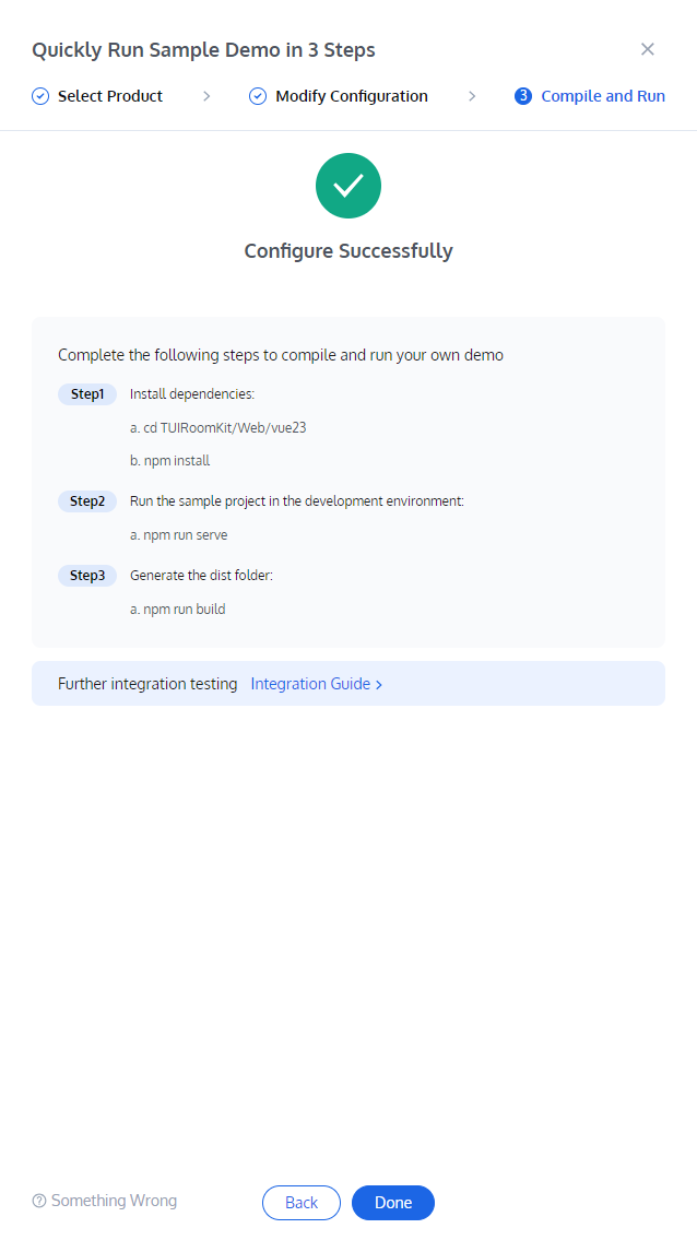 3.3 At this point, you have successfully configured it. You can follow the prompt steps to start compiling and running your own sample Demo. Click Done to complete the configuration. For further testing, click on Integration Guide to go to the Conference configuration details page.