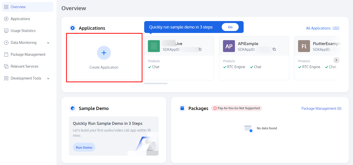 3. After completing the application creation, you will automatically enter the application details page, at which point you have quickly created an application and successfully received a free multi-person audio and video (TUIRoomKit) trial version. You can follow the three steps in the pop-up window on the right to quickly get the sample Demo running. The specific steps are as follows: