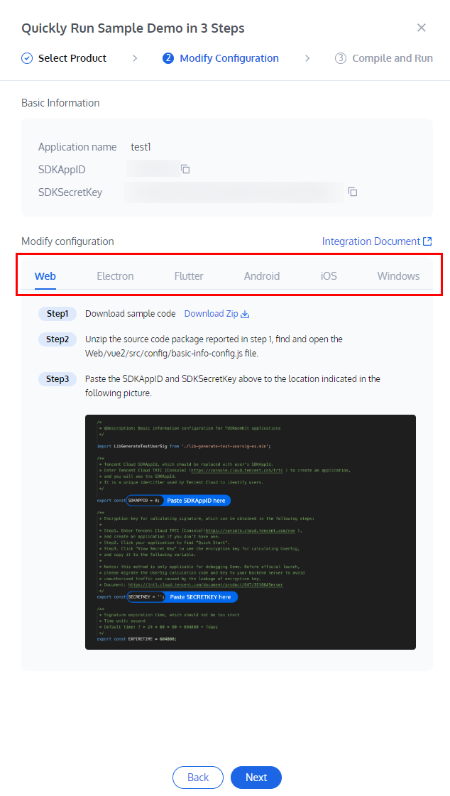 3.2 Integration Guide: Select the corresponding platform according to the application, modify the configuration following the steps. After completing the changes, click Next.