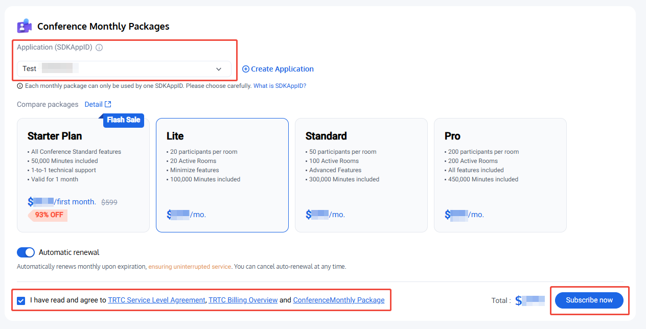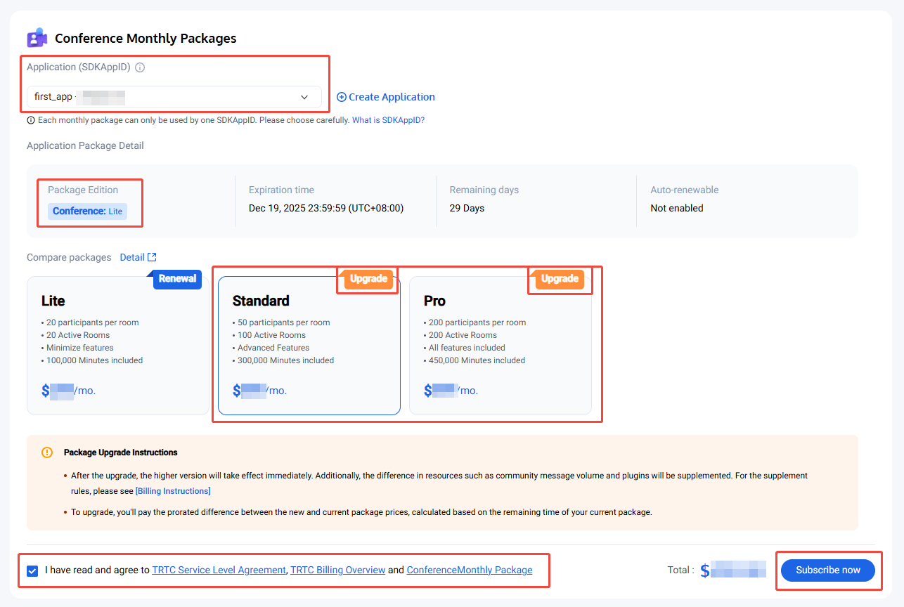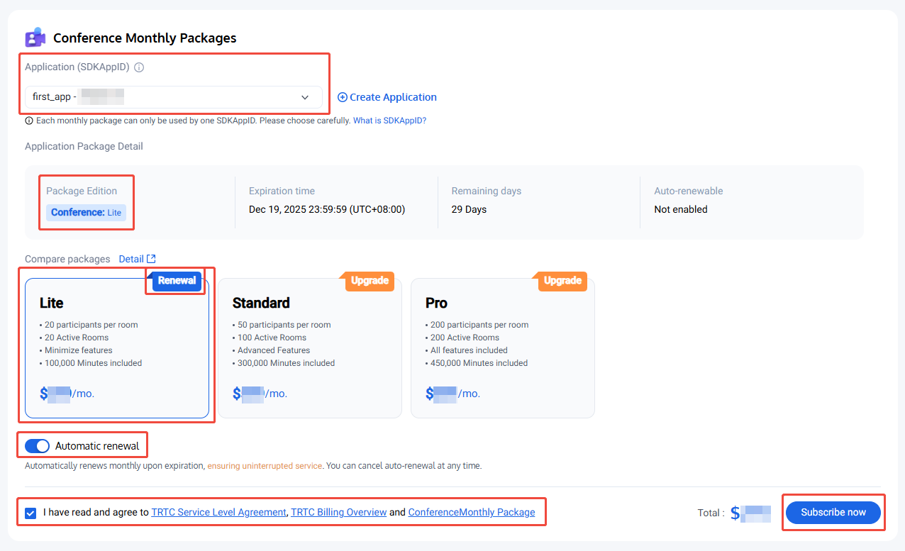 2. Visit Conference Purchase Page, confirm the application (SDKAppID) that requires upgrading, select a higher version than the application package. After confirming purchase information and agreeing to the relevant agreement, click Subscribe now. Automatic Renewal