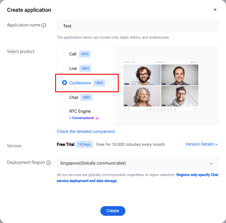 2. In the popup, enter an application name, select Conference, and choose the appropriate deployment region. Then click Create. This will create a TRTC application bound to the trial edition of TRTC Room.