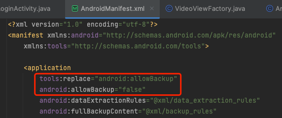 AndroidManifest.xml 中都配置了 allowBackup 属性 ,造成冲突。AndroidManifest.xml 文件中删除 allowBackup 属性或将该属性改为 false,表示关闭备份和恢复功能;并在 AndroidManifest.xml 文件的 application 节点中添加 tools:replace="android:allowBackup"表示覆盖其他模块的设置,使用您自己的设置。修复示例如图所示: