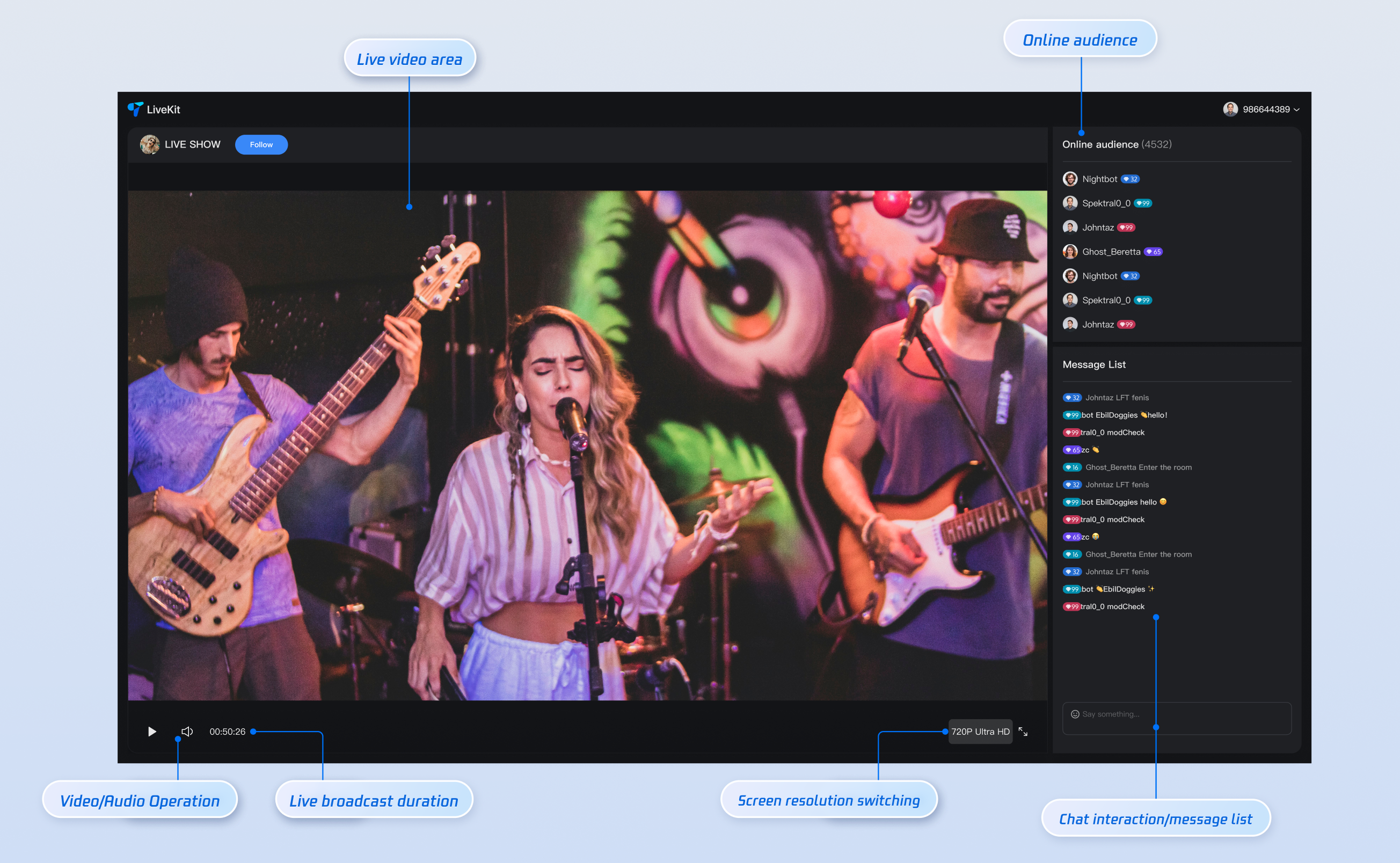 Multiple audience members can simultaneously send bullet comments, follow the host, request to connect, and more, to simulate real multi-user interaction scenarios.