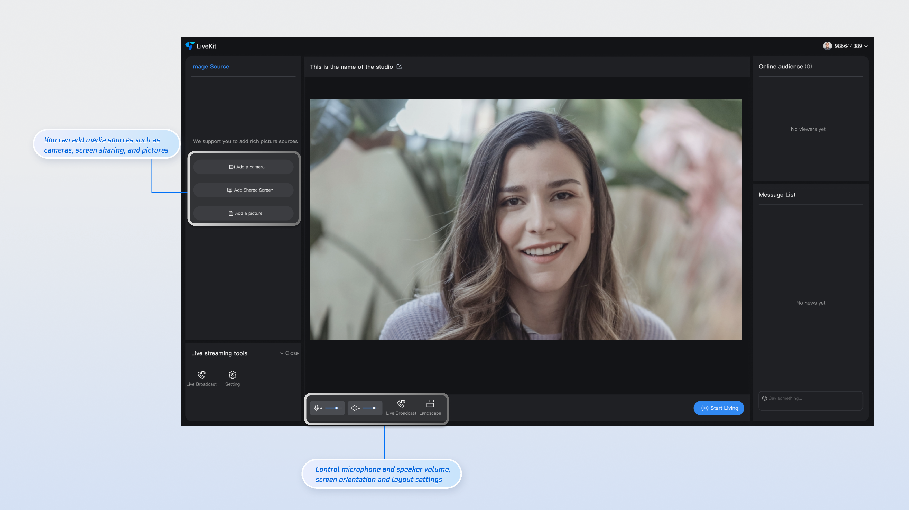 Use the material addition area on the left to add media sources, and click the Connect with Audience button to accept or reject audience connection requests.