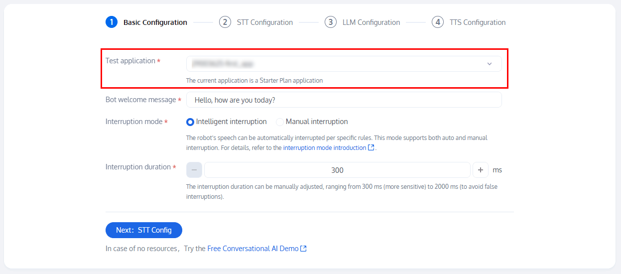 On the Basic Configuration page, you first need to select the application you want to test. You can enable the STT service for the application to use the AI service and STT Automatic Speech Recognition feature by proceeding to purchase the RTC-Engine Monthly Packages (including Starter Plan). 2. Basic Configuration Items