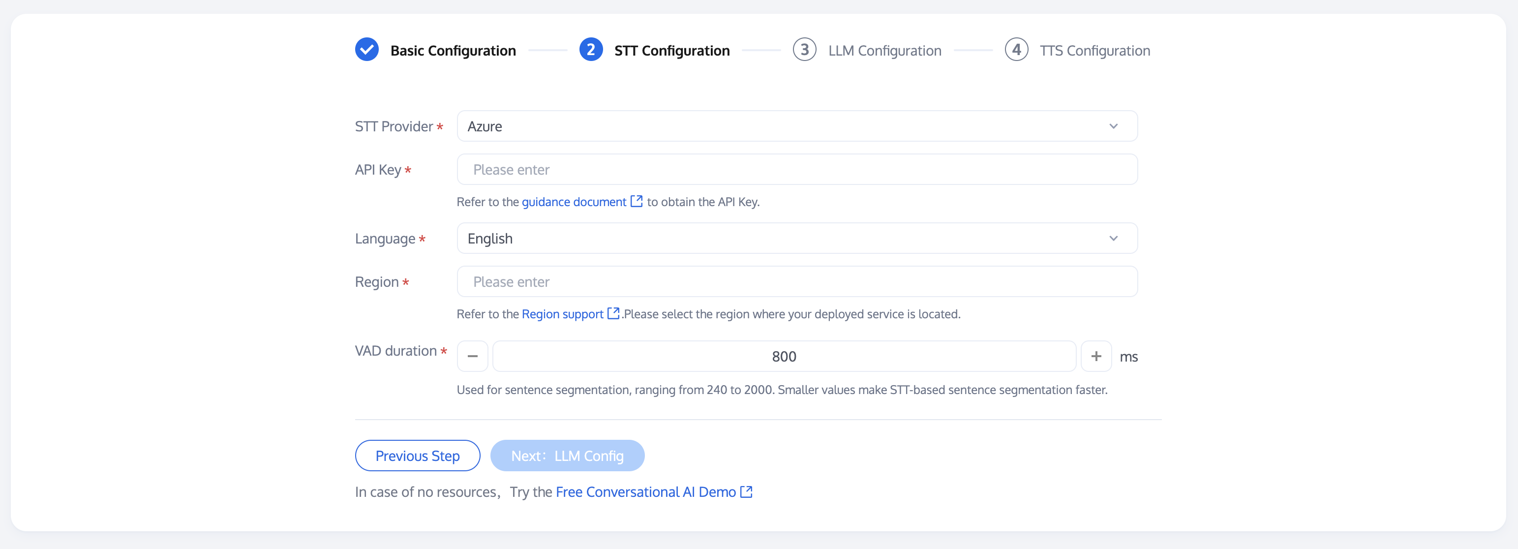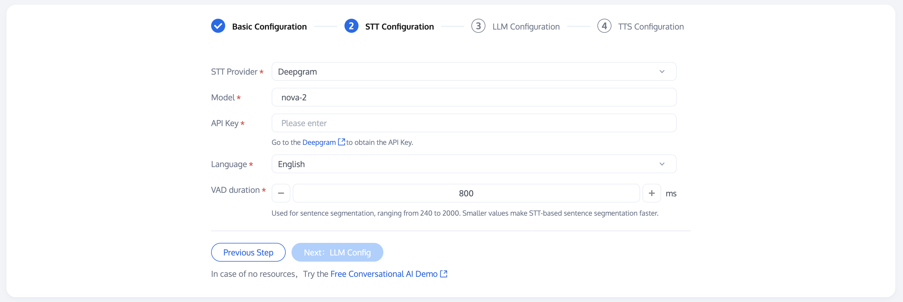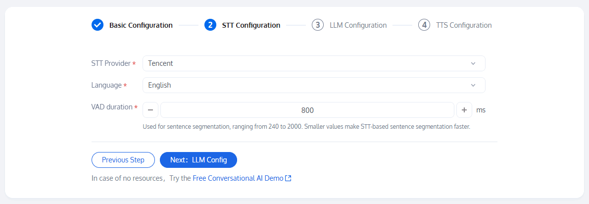 The STT speech recognition configuration model can choose Tencent, Azure, and Deepgram. It supports multiple languages, and the VAD duration can be adjusted. The setting range is 240-2000. A smaller value will make the speech recognition sentence segmentation faster. After the configuration is completed, click Next.