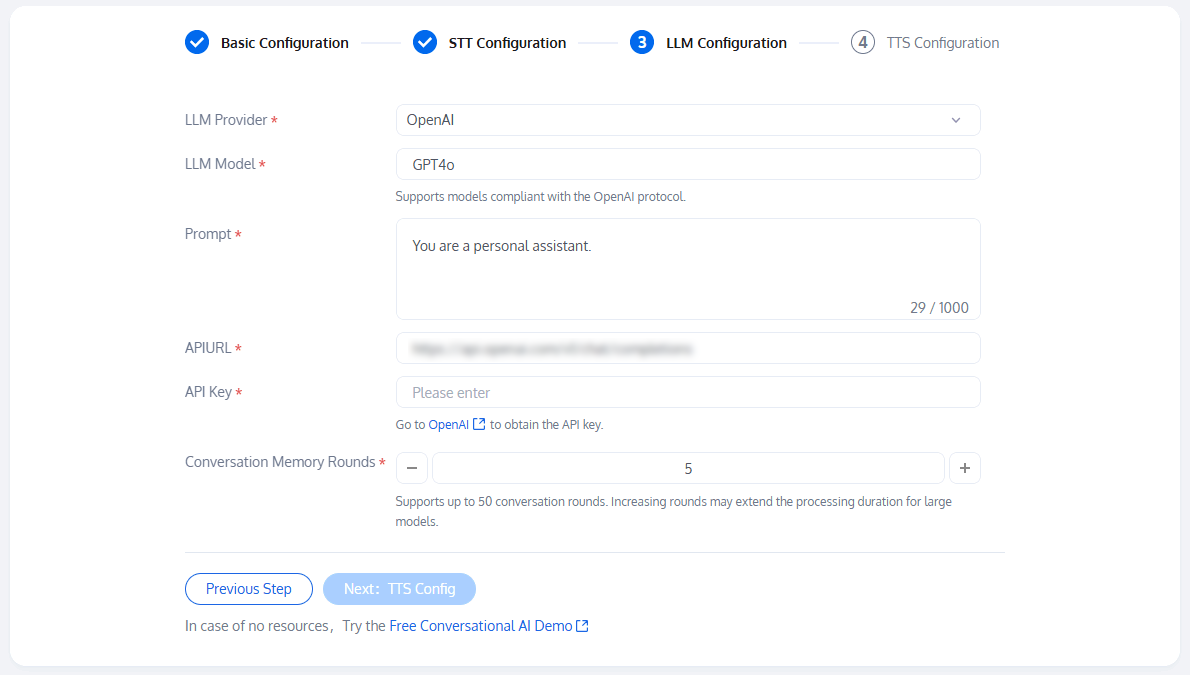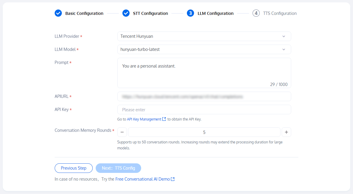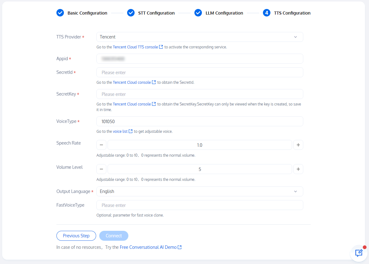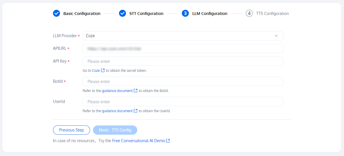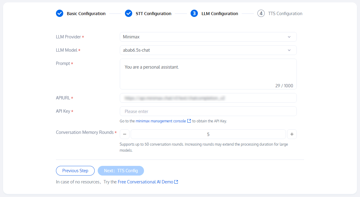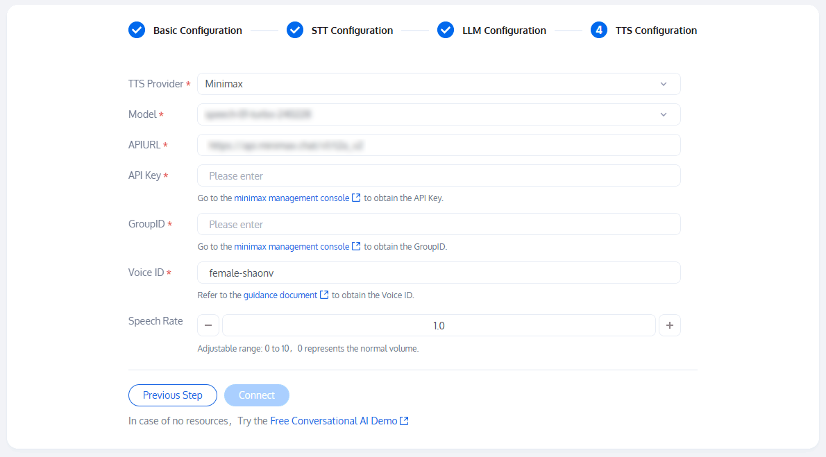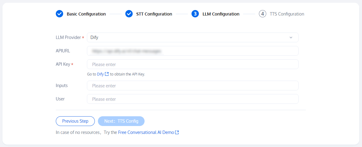 When selecting Minimax as the LLM provider, we provide default parameters; you can fine-tune them according to your needs. The LLM model can be freely selected from the dropdown option, and the API Key can be obtained from Minimax management console. When selecting Hunyuan as the LLM provider, we provide default parameters for other configurations; you can fine-tune them according to your needs. The LLM model can be freely selected from the dropdown option, and the API Key can be obtained from API Token Management. When selecting Coze as the LLM provider, we provide default parameters for other configurations; you can fine-tune them according to your needs. The API Key can be obtained by going to Coze to get the Secret token, and see guidance document to obtain BotId. When selecting Dify as the LLM provider, we provide default parameters for other configurations; you can fine-tune them according to your needs. The API Key can be obtained from Dify. STEP 4: TTS (Text To Speech) Configuration