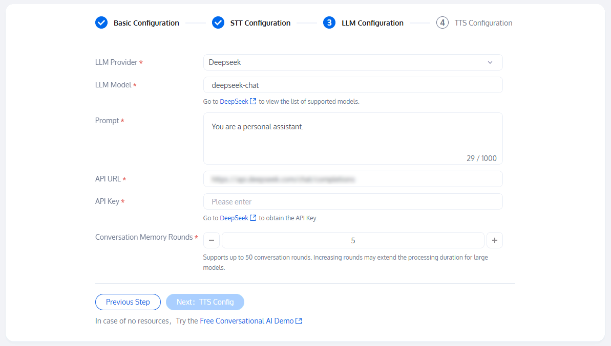 On this page, you need to apply for third-party resources for configuration: LLM providers support OpenAI, Deepseek, Minimax, Tencent Hunyuan, Coze, and Dify. After the configuration is completed, click Next.
