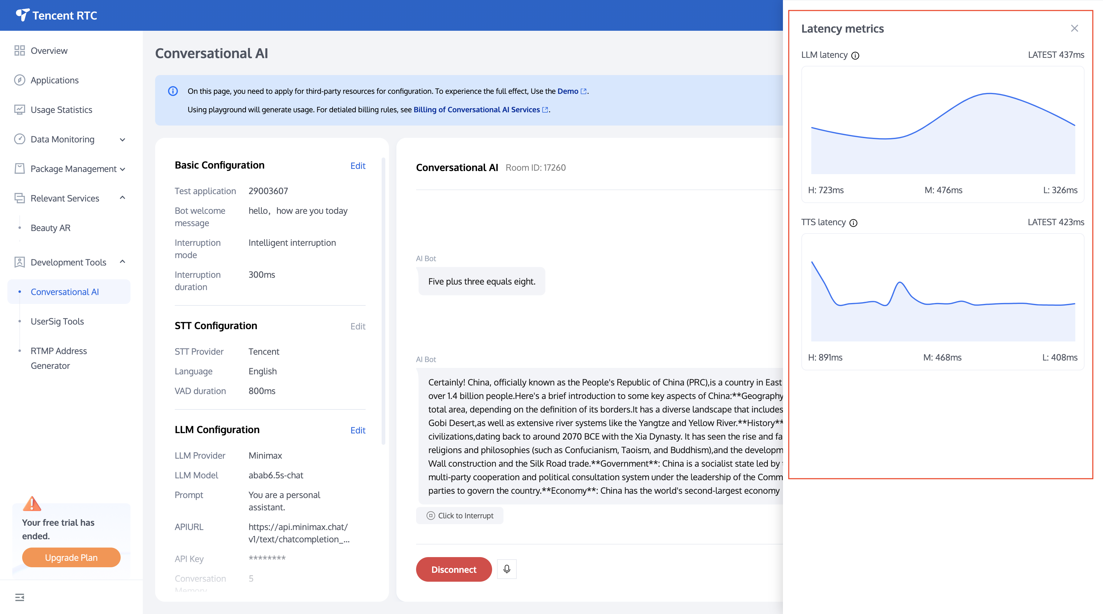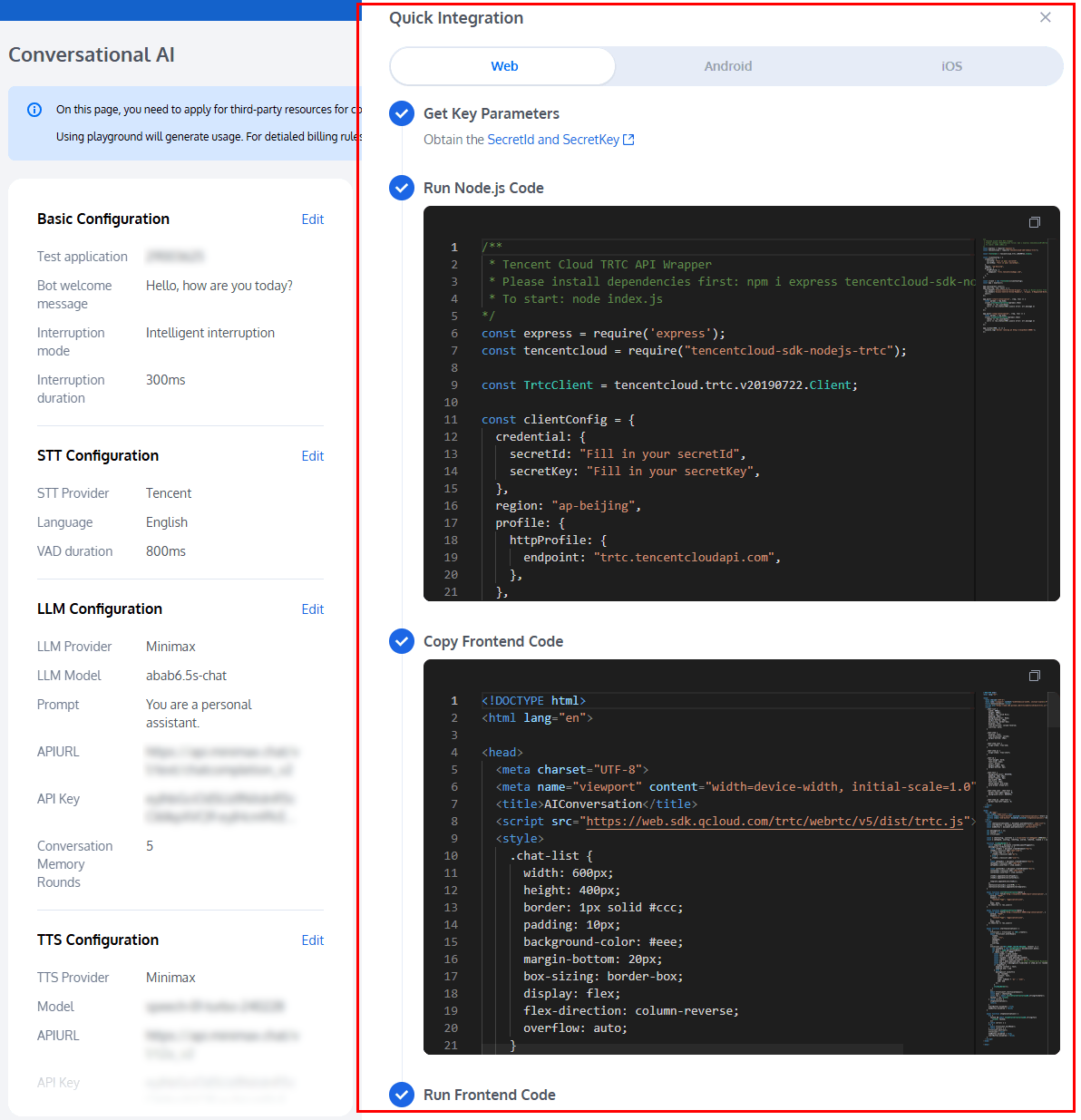 Tencent RTC provides a convenient testing and verification platform, supporting the connection to third-party STT, LLM, and TTS capacities for rapid configuration. It enables the quick implementation of conversational AI services without coding for verification tests, facilitating efficient development and deployment. This article will introduce how to use this tool.