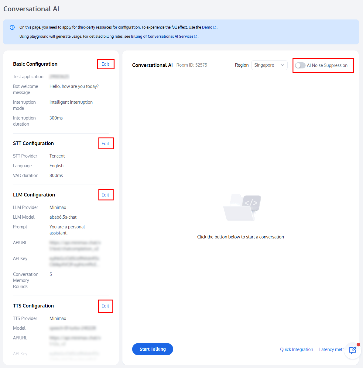 During the conversation, it supports editing and modifying interruption duration, LLM configuration, and TTS configuration to facilitate effect evaluation.
