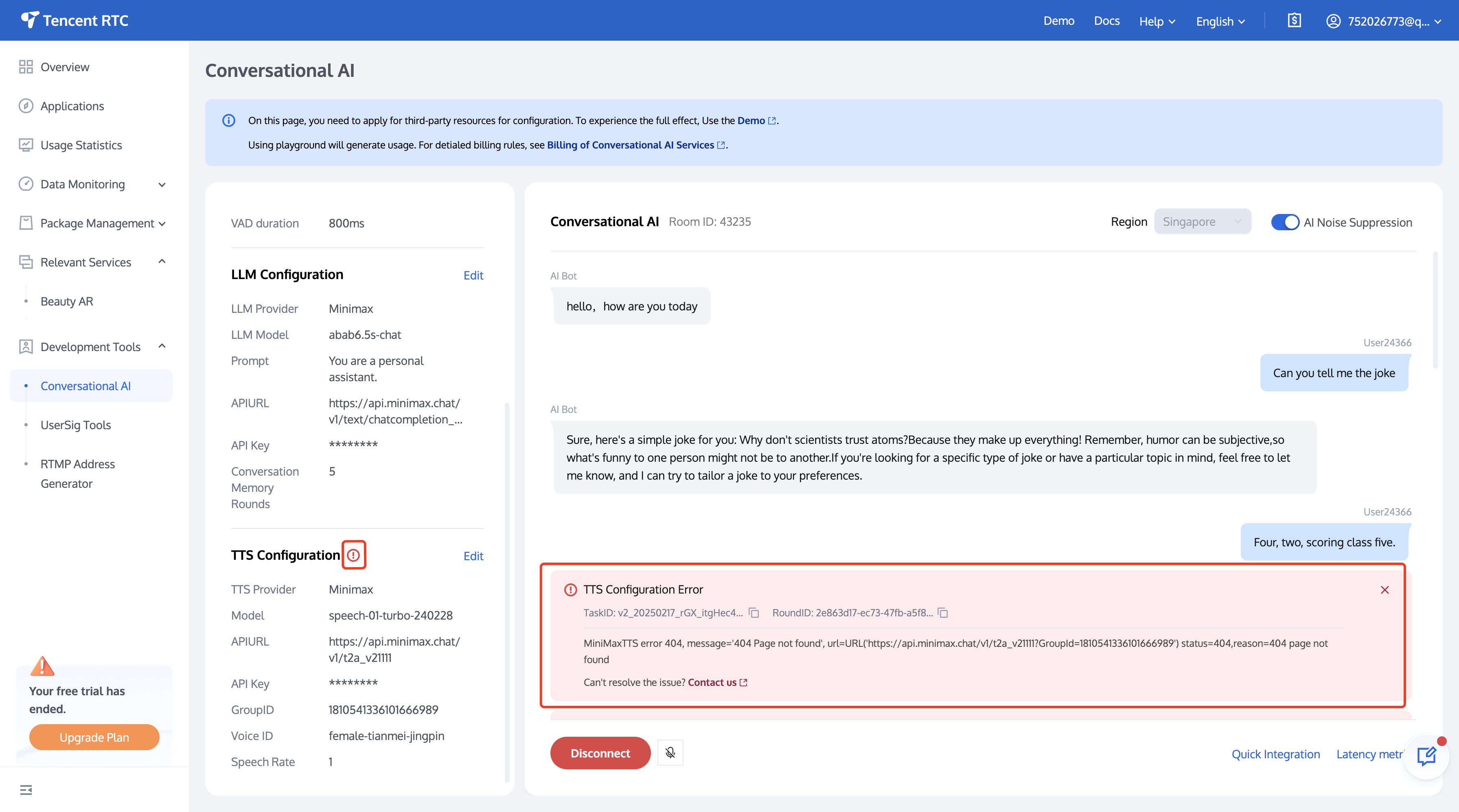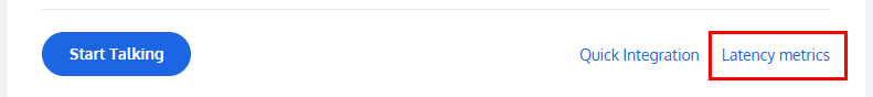 During the conversation, if there is a display of error codes: Please note that some error codes may block the dialogue. Modify the configuration according to the error prompt in time. If it cannot be resolved, copy the Task ID and Round ID information and contact us for query. Some error codes do not affect the normal progress of the dialogue, such as response timeout, which you can handle according to the actual situation. View Latency Metrics