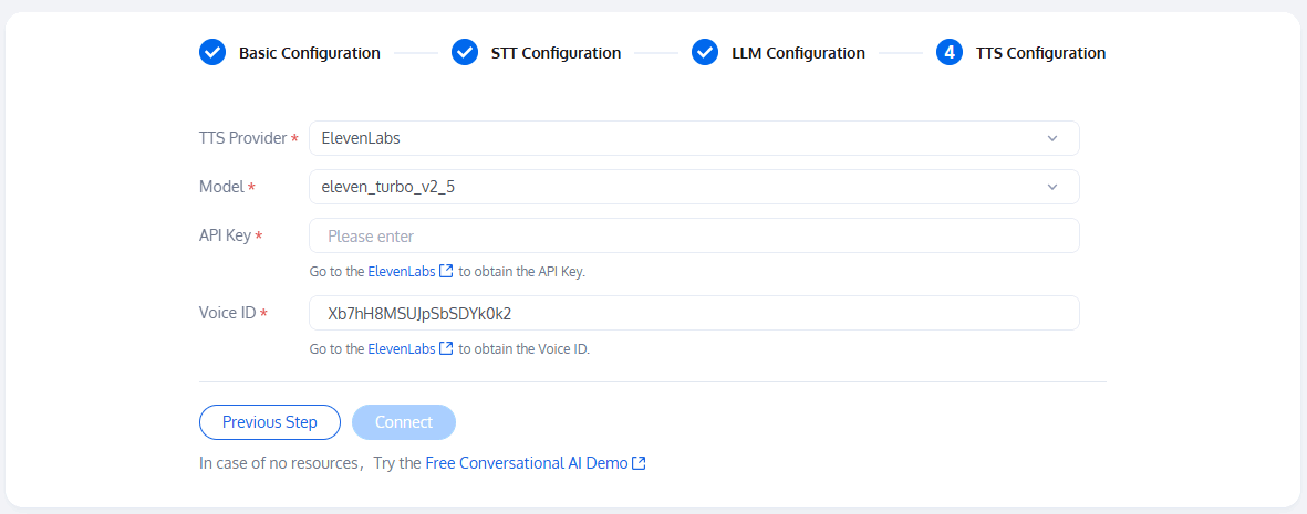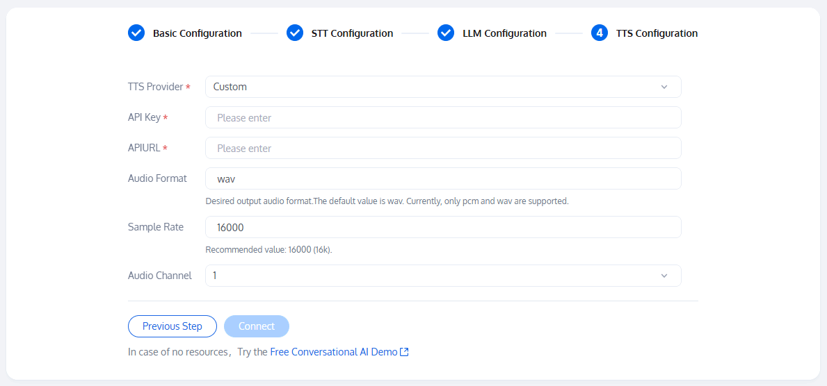 On the TTS (Text To Speech) configuration page: The TTS provider supports Tencent, Minimax, Azure, Cartesia, Elevenlabs, and custom. After completing the configuration, click Connect, if the configuration information is correct, you will enter the Start Conversation page.
