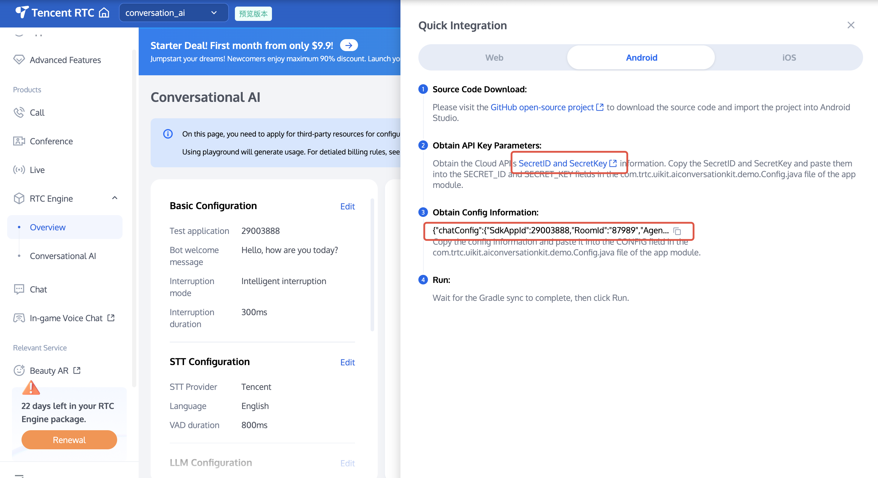 startParams.secretId and startParams.secretKey.startParams.llmConfig, and copy the string value corresponding to TTSConfig to startParams.ttsConfig.Feedback