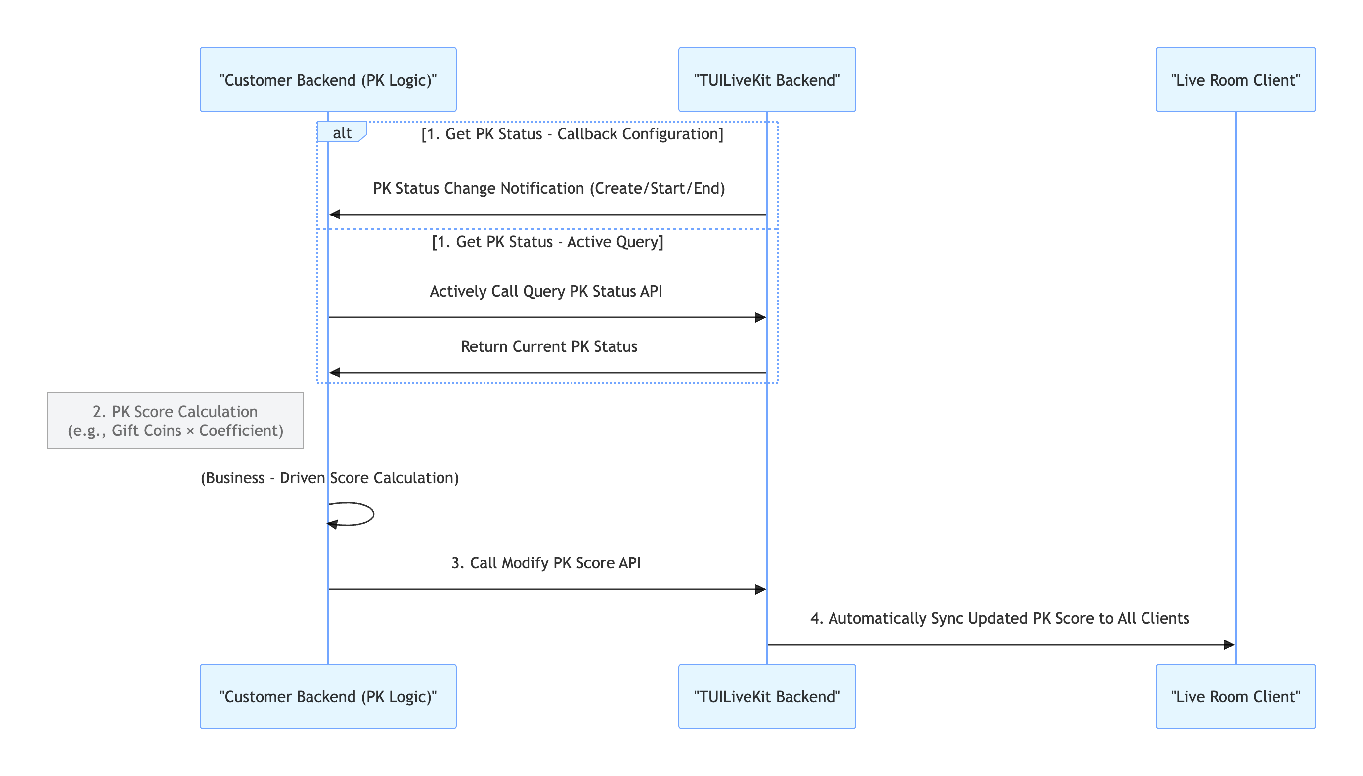 TUILiveKit integrates with your billing system via a callback mechanism. You need to implement your own user account system, handle the deduction verification callback, and manage the points distribution rules.TUILiveKit is based on a pure numerical accumulation mechanism. You need to calculate the PK score increase for each gift according to your business needs, and then call the TUILiveKit interface to update the score. TUILiveKit will automatically synchronize the score to the client.Postman or Apifox to directly call the REST APIs provided by TUILiveKit to configure the gift list.Feedback