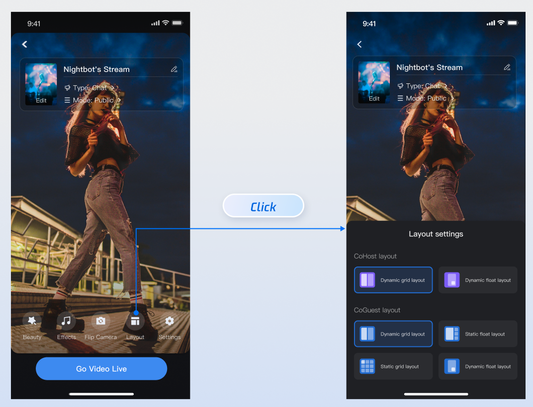 Description | The default layout; grid size adjusts dynamically based on the number of co-hosts. | Co-hosts are displayed in floating small windows. | The number of co-hosts is fixed, and each co-host occupies a fixed grid cell. | The number of co-hosts is fixed, and co-hosts are displayed in fixed small windows. |