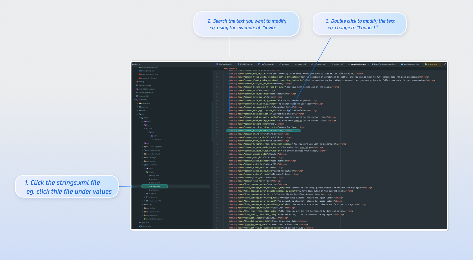 AnchorView Feature AreaanchorView created in Step 4, you can customize and hide the operation area or specific features on the host live page:import android.os.Bundleimport androidx.appcompat.app.AppCompatActivityimport com.tencent.cloud.tuikit.engine.extension.TUILiveListManagerimport com.tencent.cloud.tuikit.engine.room.TUIRoomDefineimport com.trtc.uikit.livekit.features.anchorboardcast.AnchorViewimport com.trtc.uikit.livekit.features.anchorboardcast.AnchorViewDefine.RoomBehaviorimport com.trtc.uikit.livekit.features.anchorprepare.AnchorPrepareViewDefine.LiveStreamPrivacyStatus.PUBLICclass YourActivity : AppCompatActivity() {override fun onCreate(savedInstanceState: Bundle?) {super.onCreate(savedInstanceState)val anchorView = AnchorView(this)val liveInfo = TUILiveListManager.LiveInfo()liveInfo.roomInfo = TUIRoomDefine.RoomInfo();liveInfo.roomInfo.roomId = "live_1236666"liveInfo.roomInfo.name = anchorPrepareView.state?.roomName?.getValue()liveInfo.isPublicVisible = anchorPrepareView.state?.liveMode?.getValue() == PUBLICliveInfo.coverUrl = anchorPrepareView.state?.coverURL?.getValue()liveInfo.seatLayoutTemplateId = anchorPrepareView.state.coGuestTemplateId.getValue()!!anchorView.init(liveInfo, anchorPrepareView?.coreView, RoomBehavior.CREATE_ROOM, null)// 1. Custom function area - Example: Hide the anchor connection featureanchorView.disableFooterCoHost(true)setContentView(anchorView)}}