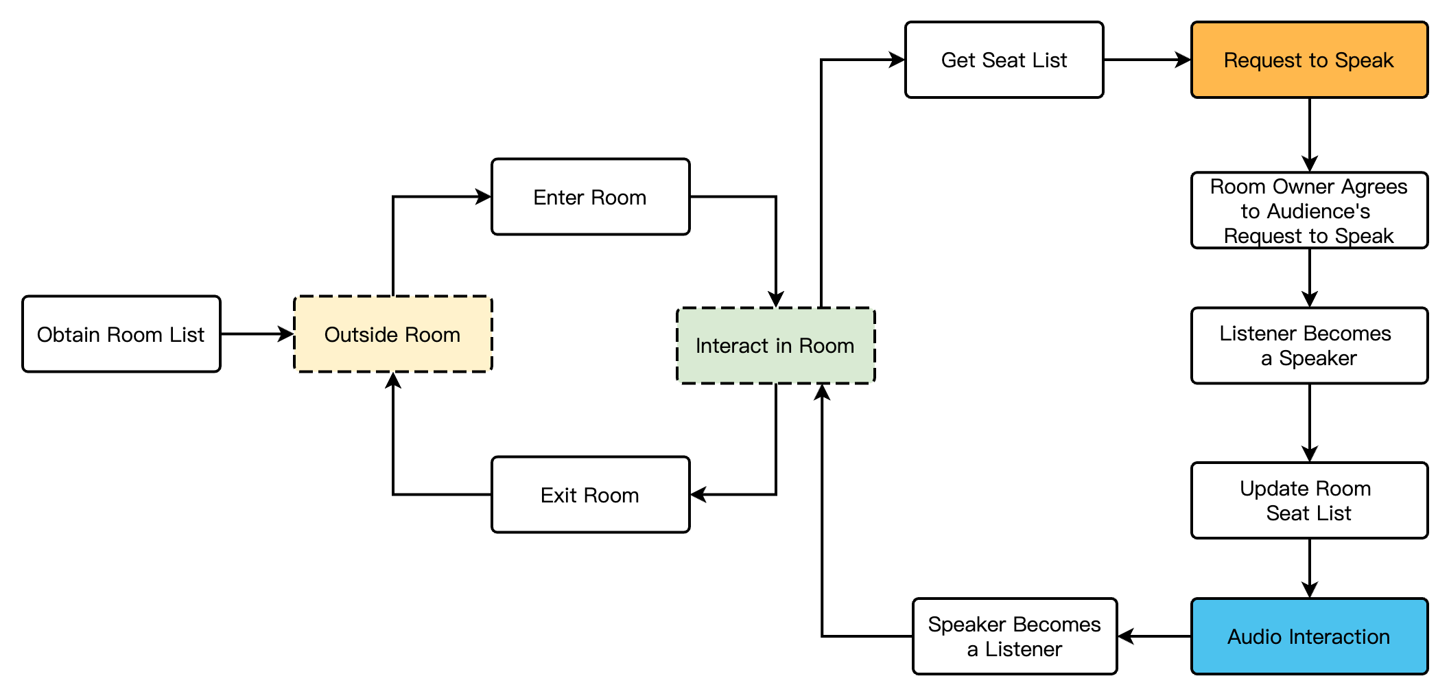 Listeners | Room seat participants who engage in voice interactions. | The role can be either audience or anchor. Request to speak/become a listener |