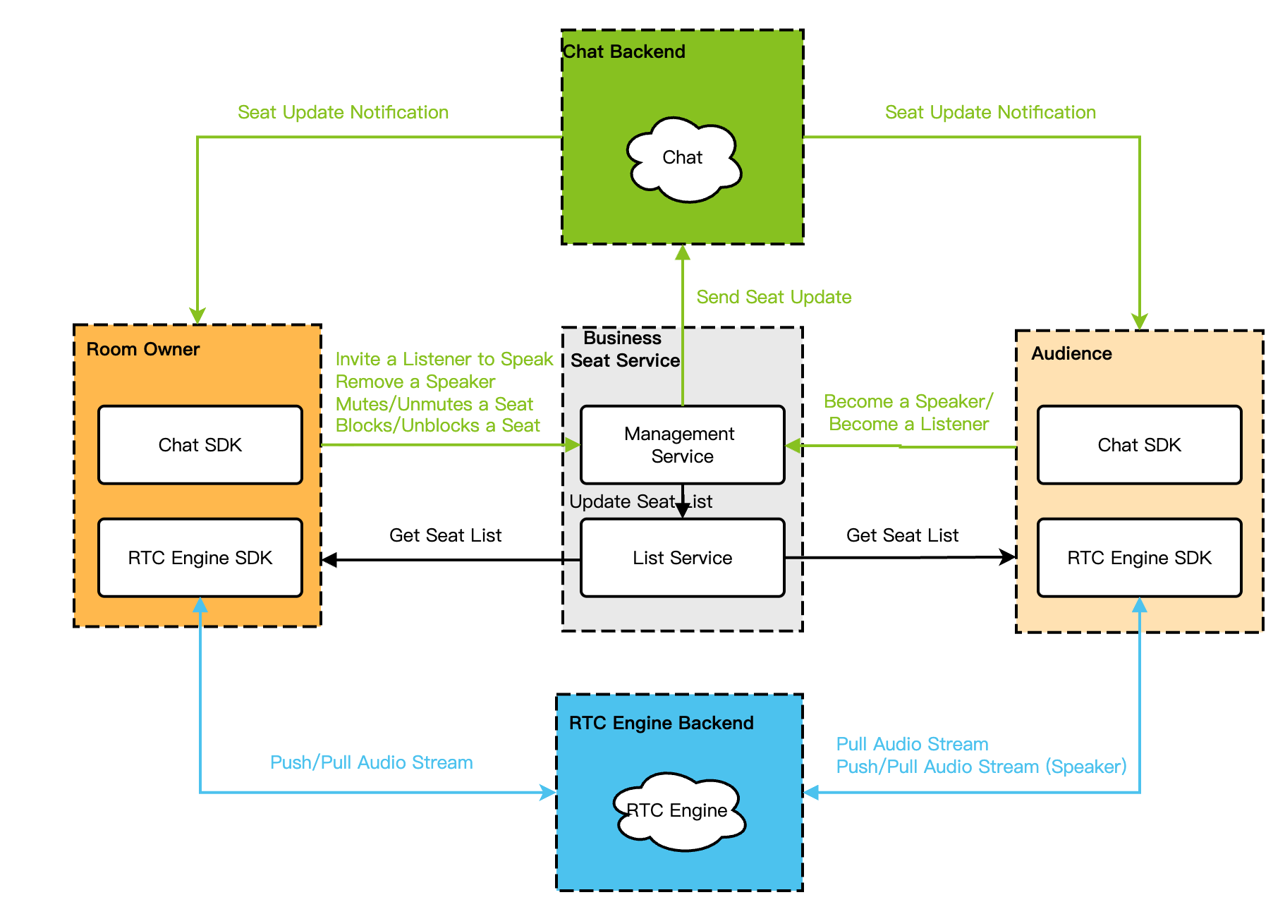 Seat Management | Become a speaker, invite a listener to speak, become a listener, remove a speaker, mute a seat, lock a seat and move a seat. |