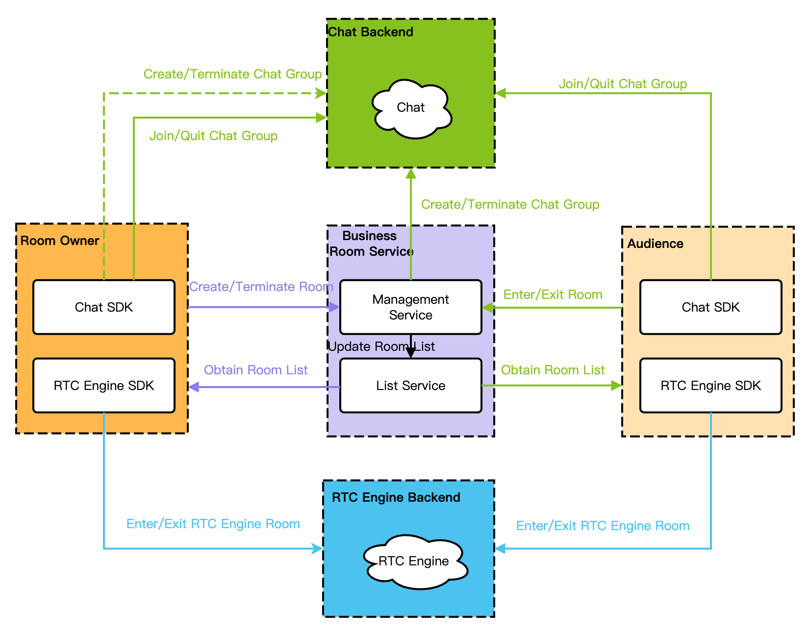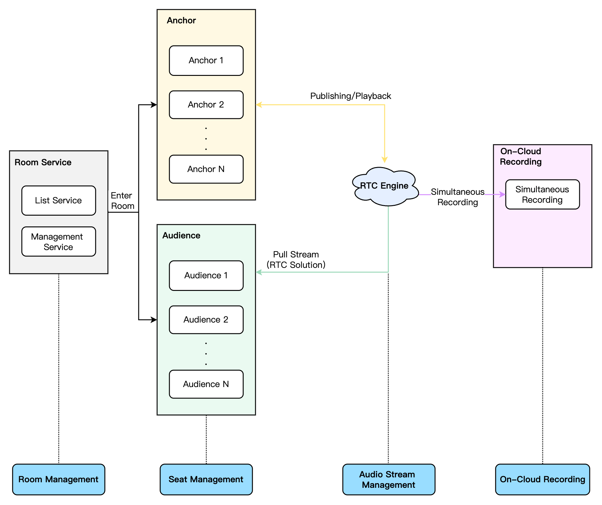 RTC Engine Room Management: Mainly used for interaction and transmission of audio streams, such as sending and listening to voice/music of anchors/listeners. It also distinguishes by room dimension, with features including entering/exiting RTC Engine rooms.