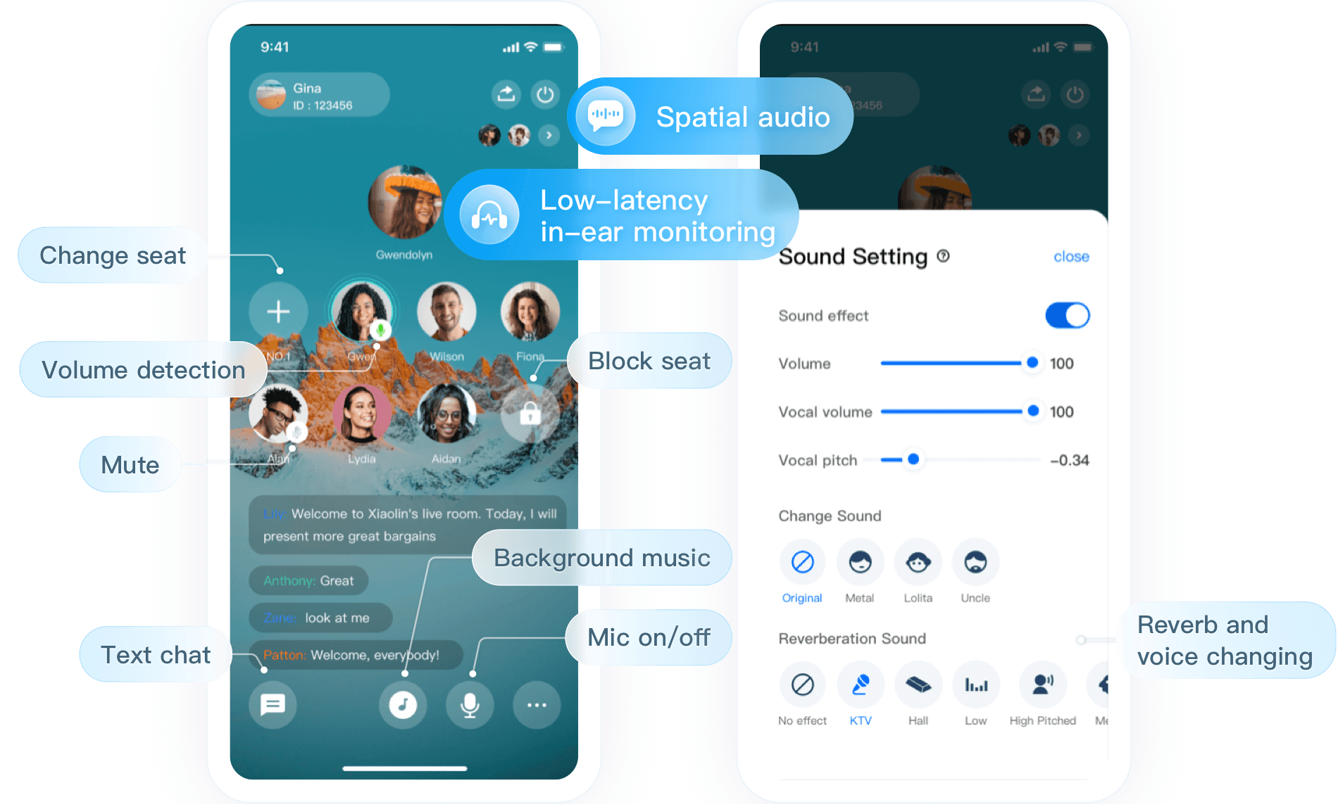 There may be a solo live broadcast by an anchor or a host with several fixed chatting guests, while background music and sound effects are played simultaneously. Listeners can request to speak by giving gifts to participate in voice interaction.