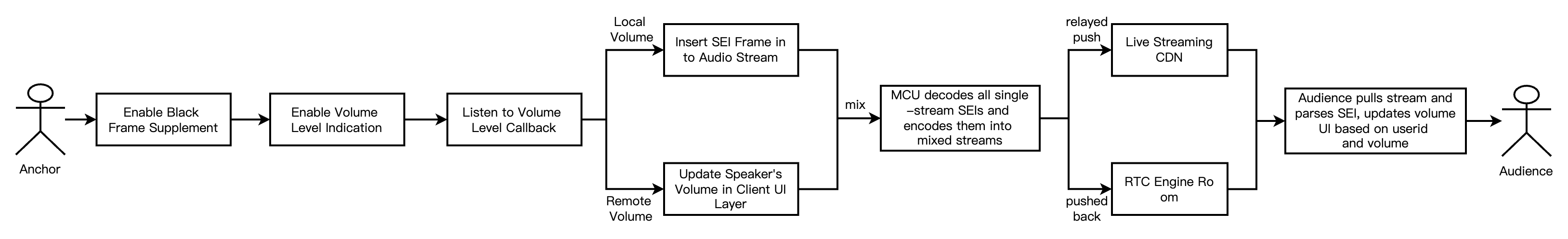 The implementation process of evaluating single stream volume in audio-only mixed stream is shown in the diagram above. Speakers need to listen for volume level callback and determine both local and remote volume levels. Then, insert the local volume value and user information into the audio stream in the form of SEI messages. After mixing, these messages are transmitted to listeners. Alternatively, the room owner can send out speakers' callback volume values through SEI messages. The diagram below shows the sequence diagram of the entire process: