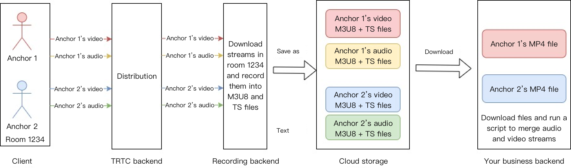 Mixed Stream Recording: Mix and record the audio media streams from the same room into a single file.