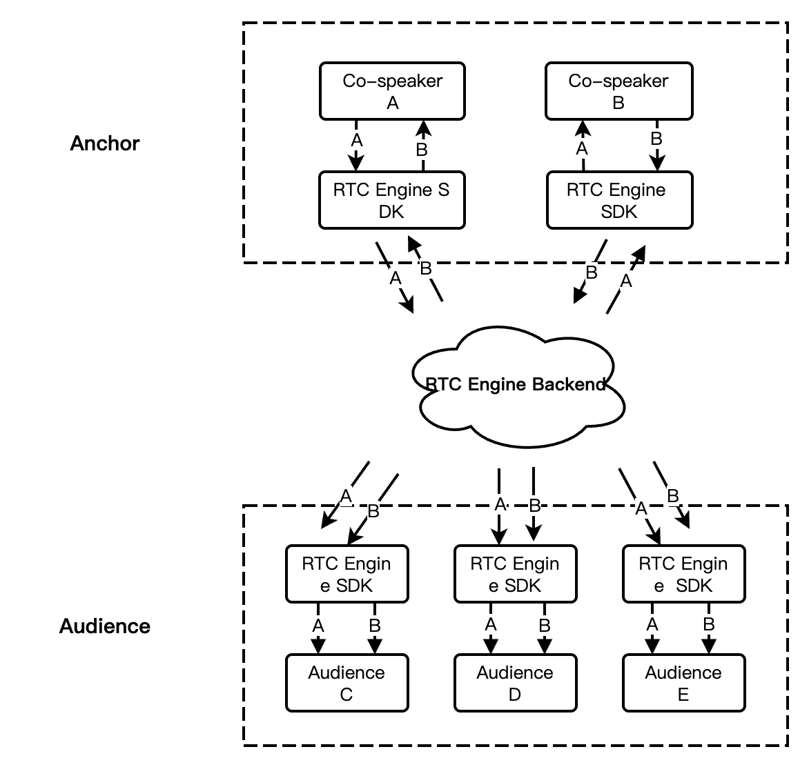 This scenario usually involves a considerable audience size. A single RTC Engine room can simultaneously support up to 100,000 users, and is suitable for the solution of anchor streaming and playback of RTC streams as well as audience streaming and playback of RTC single streams.
