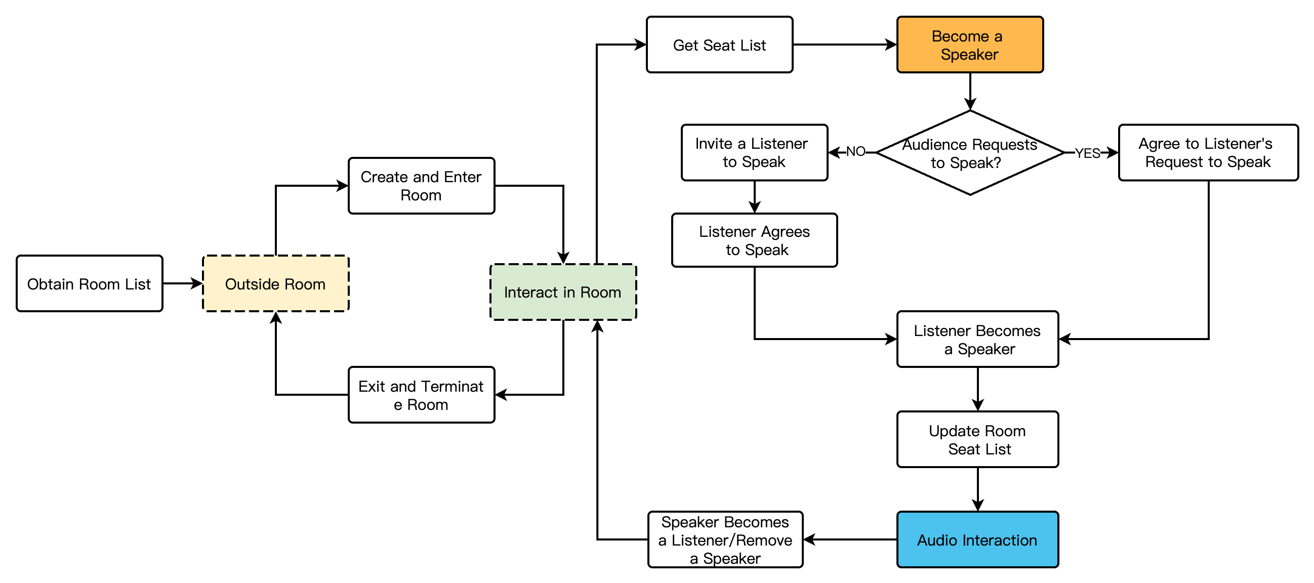 Listeners | Participants in the room can also take the mic to become the anchor. | The role can be either audience or anchor. Enter/Exit Room |