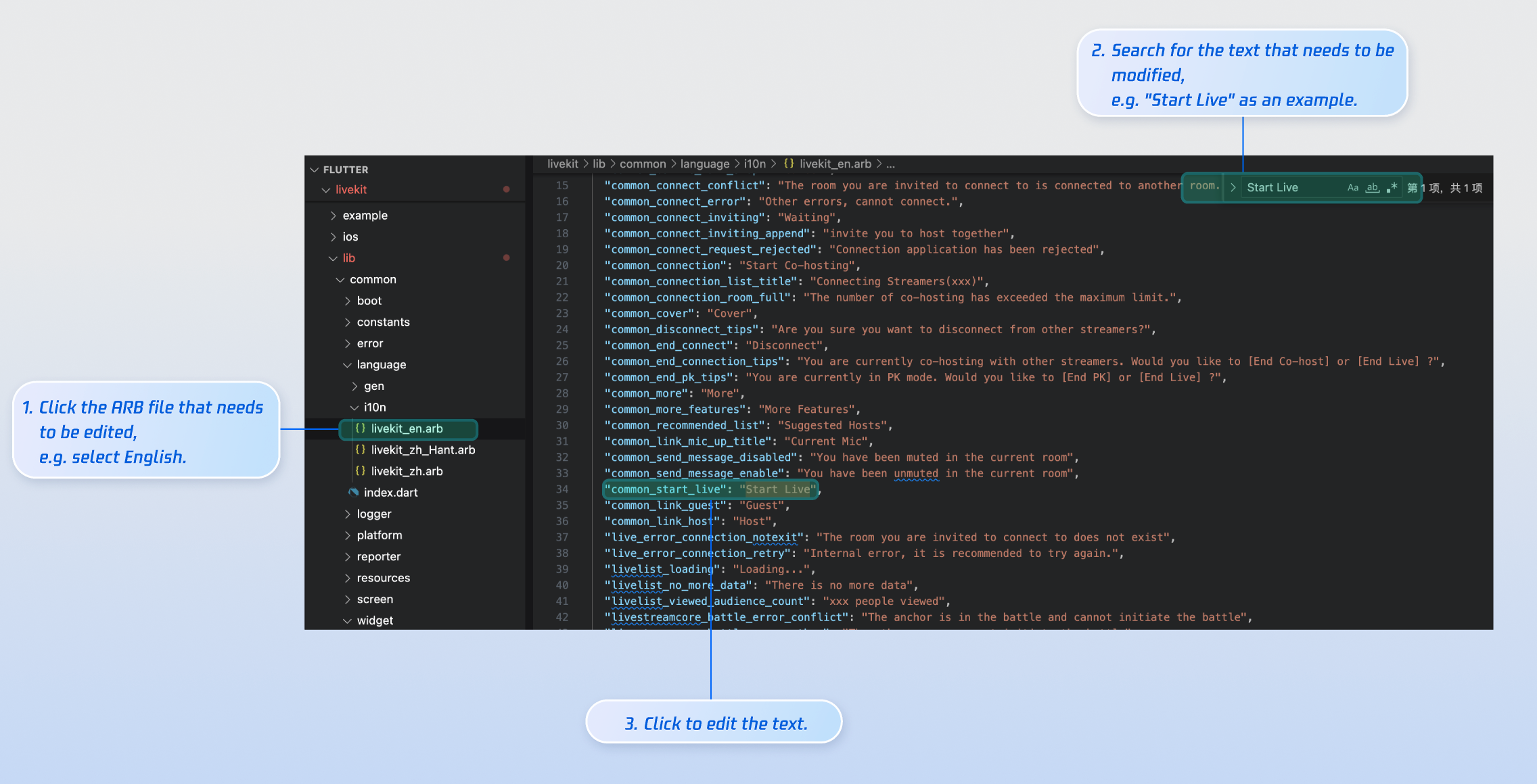 livekit/lib/common/language/i10n/ directory to modify the text: