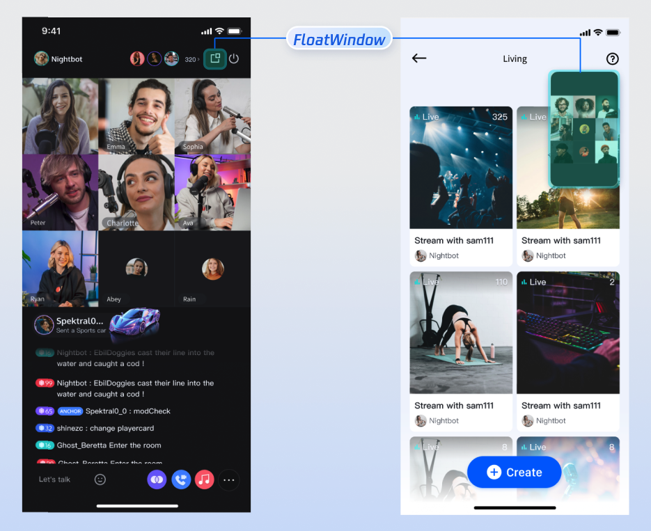 TUILiveRoomAudienceOverlay enables floating window mode for the audience viewing page. During a live stream, you can switch between in-app and out-of-app (Picture-in-Picture) floating window modes. TUILiveRoomAudienceOverlay is built using Flutter’s official Overlay API and native Picture-in-Picture. To integrate:import 'package:tencent_live_uikit/tencent_live_uikit.dart';// Navigate to the Anchor webpageNavigator.push(context, MaterialPageRoute(builder: (BuildContext context) {final roomId = "test_live_room_id";return TUILiveRoomAnchorOverlay(roomId: roomId);}));