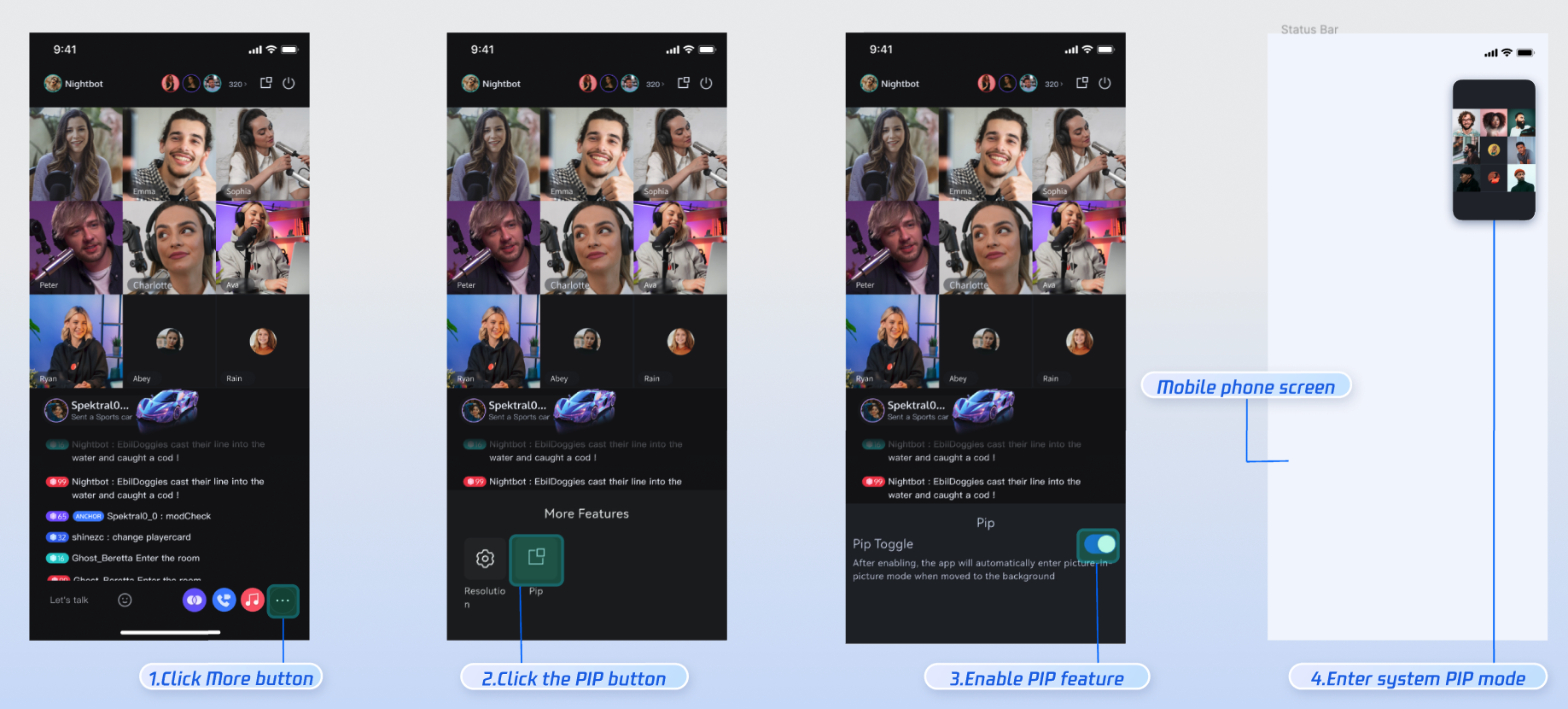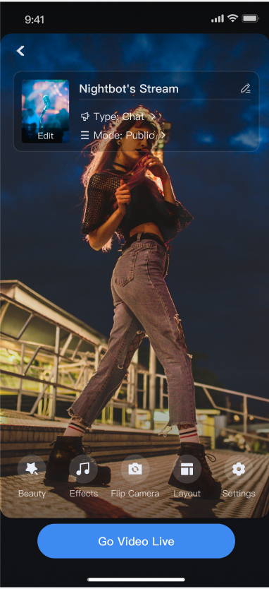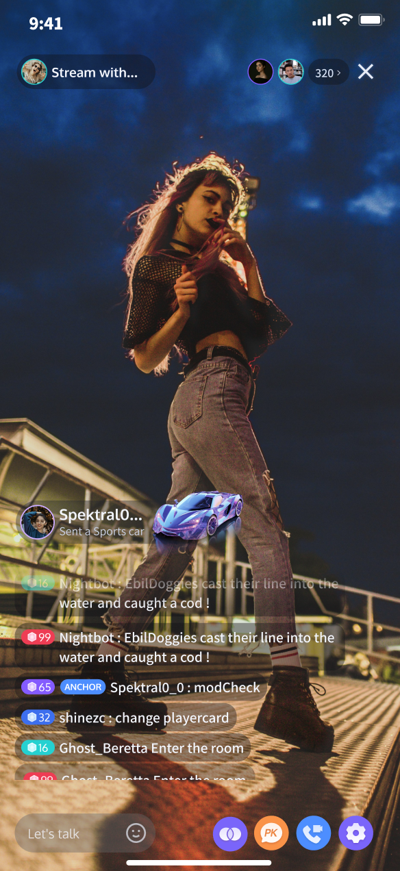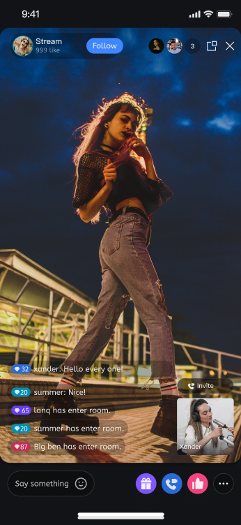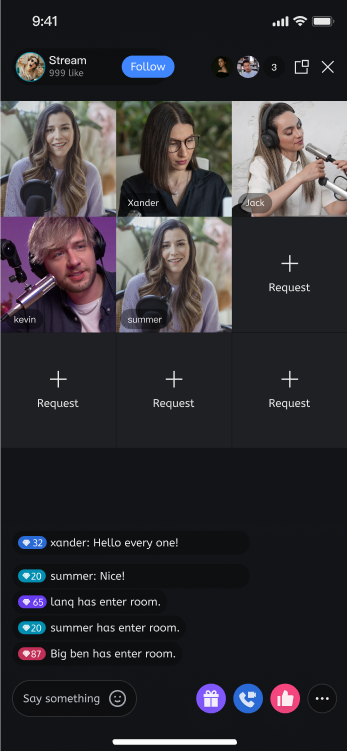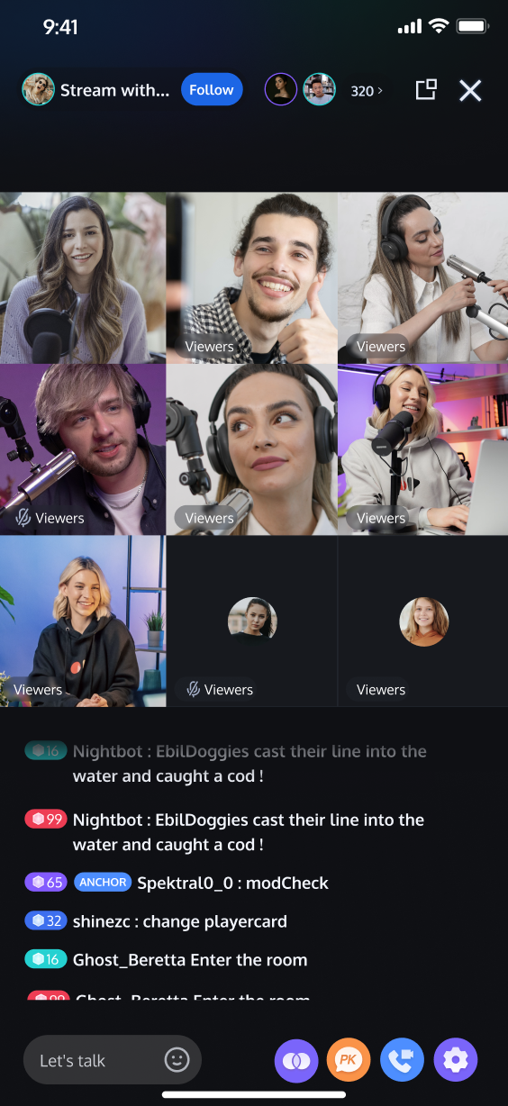 Audience Viewing | Audience can watch live streaming after entering the anchor's live streaming room, with features like audience mic connection, live room information, online audience, and bullet screen display. | |