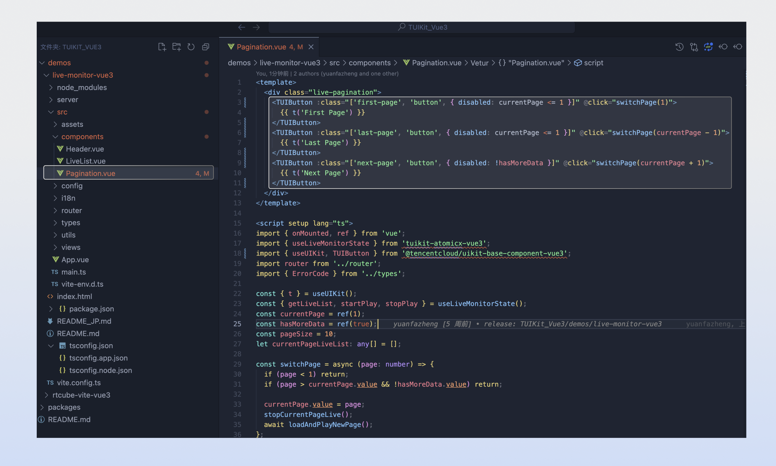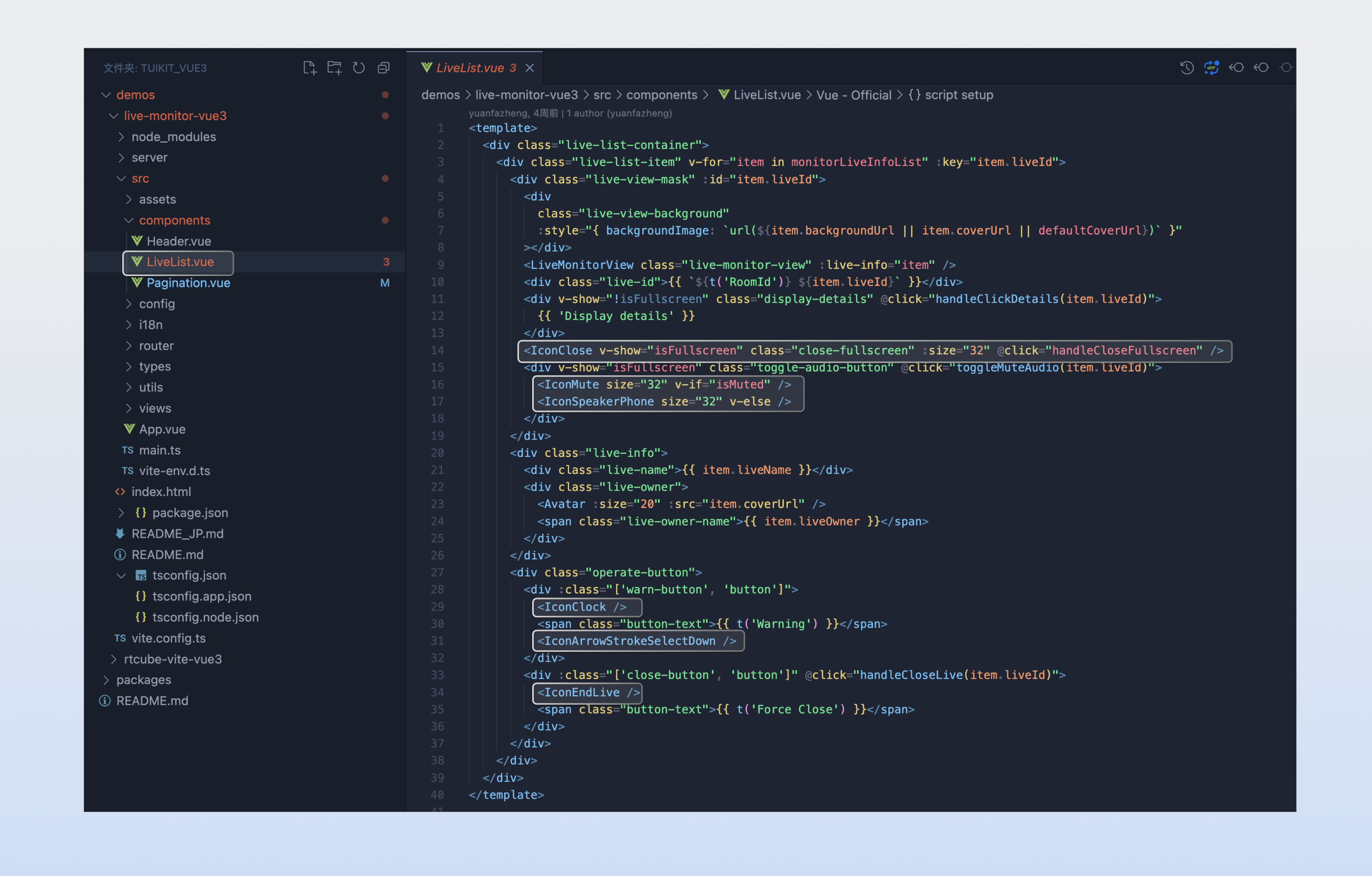 // cd TUIKit_Vue3/demos/live-monitor-vue3/src/views/live-monitor.vue<template><UIKitProvider language="zh-CN" theme="dark"><div class="live-monitor"><Header /><LiveList /><Pagination class="live-pagination" /></div></UIKitProvider></template><script setup lang="ts">import { useLiveMonitorState } from 'tuikit-atomicx-vue3';import { UIKitProvider } from '@tencentcloud/uikit-base-component-vue3';import { createBasicAccount } from '../config';import Header from '../components/Header.vue';import LiveList from '../components/LiveList.vue';import Pagination from '../components/Pagination.vue';const account = createBasicAccount();const { init } = useLiveMonitorState();if (account) {init({baseUrl: 'http://localhost:9000/api', // Default access address in procedure 4account: {sdkAppId: 0, // TheSDKAppIDof your TUILiveKit serviceuserId: '',// The user's userId in procedure 1password: '',// The user's userSig in procedure 1},});}</script>