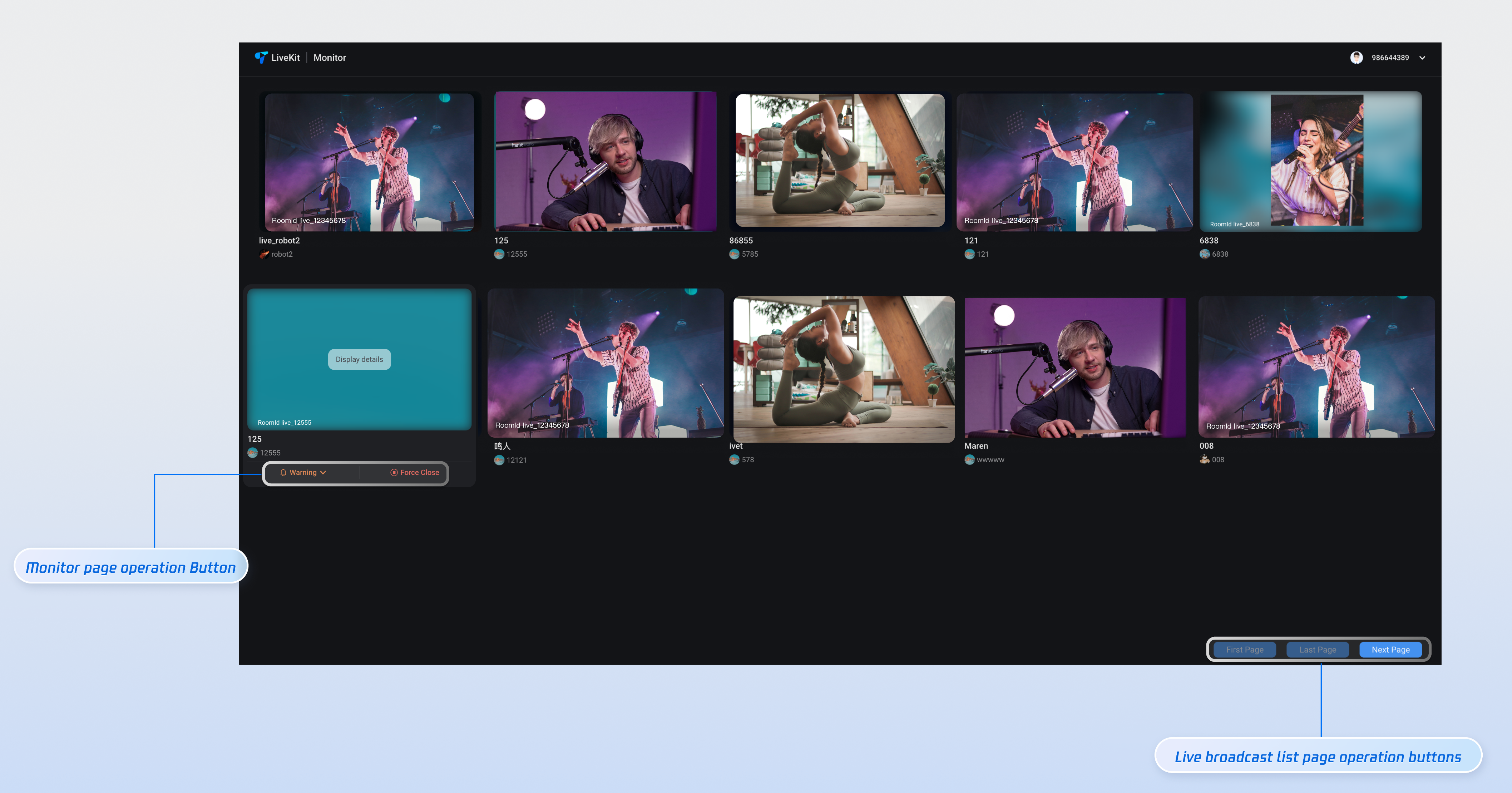 Dismiss rule-violating live streaming room with one click | Operate directly on the details page or monitoring panel to quickly shut down live streaming rooms with rule violations and enhance handling efficiency. |