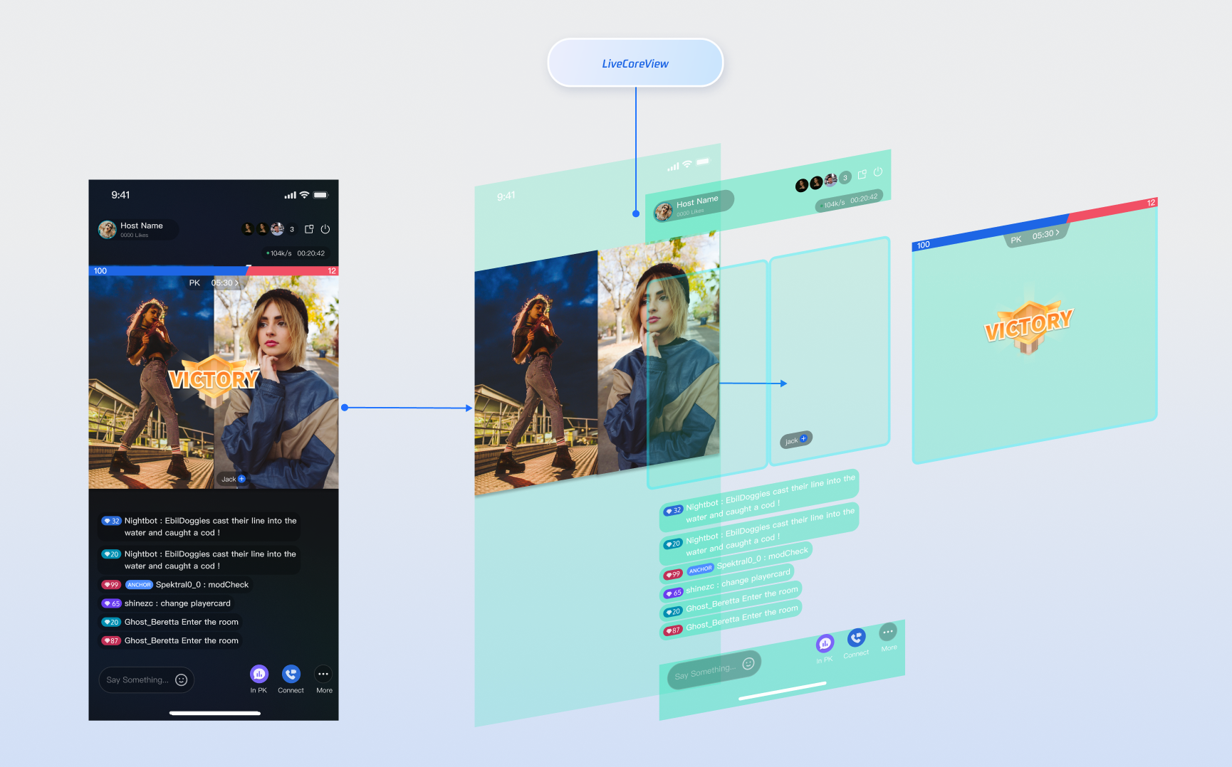 LiveCoreView | Handles publishing, playing, and rendering audio/video streams. Provides adapter interfaces for integrating custom UI components (e.g., user info, PK progress bar). | viewType:.pushView (host publishing view).playView (audience playback view)setLiveId(): Binds the live room ID for this view.videoViewDelegate: Adapter for custom video display UI slots. |