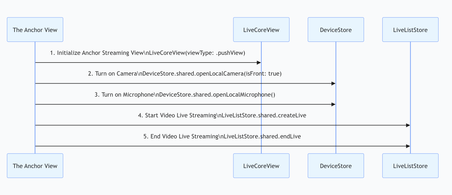 DeviceStore.shared.openLocalCamera and DeviceStore.shared.openLocalMicrophone to open the camera and microphone. No further action is required—LiveCoreView automatically previews the current camera video stream.import AtomicXCoreclass YourAnchorViewController: UIViewController {// ... other code ...public override func viewDidLoad() {super.viewDidLoad()// Enable devicesopenDevices()}private func openDevices() {// 1. Enable front cameraDeviceStore.shared.openLocalCamera(isFront: true, completion: nil)// 2. Enable microphoneDeviceStore.shared.openLocalMicrophone(completion: nil)}}