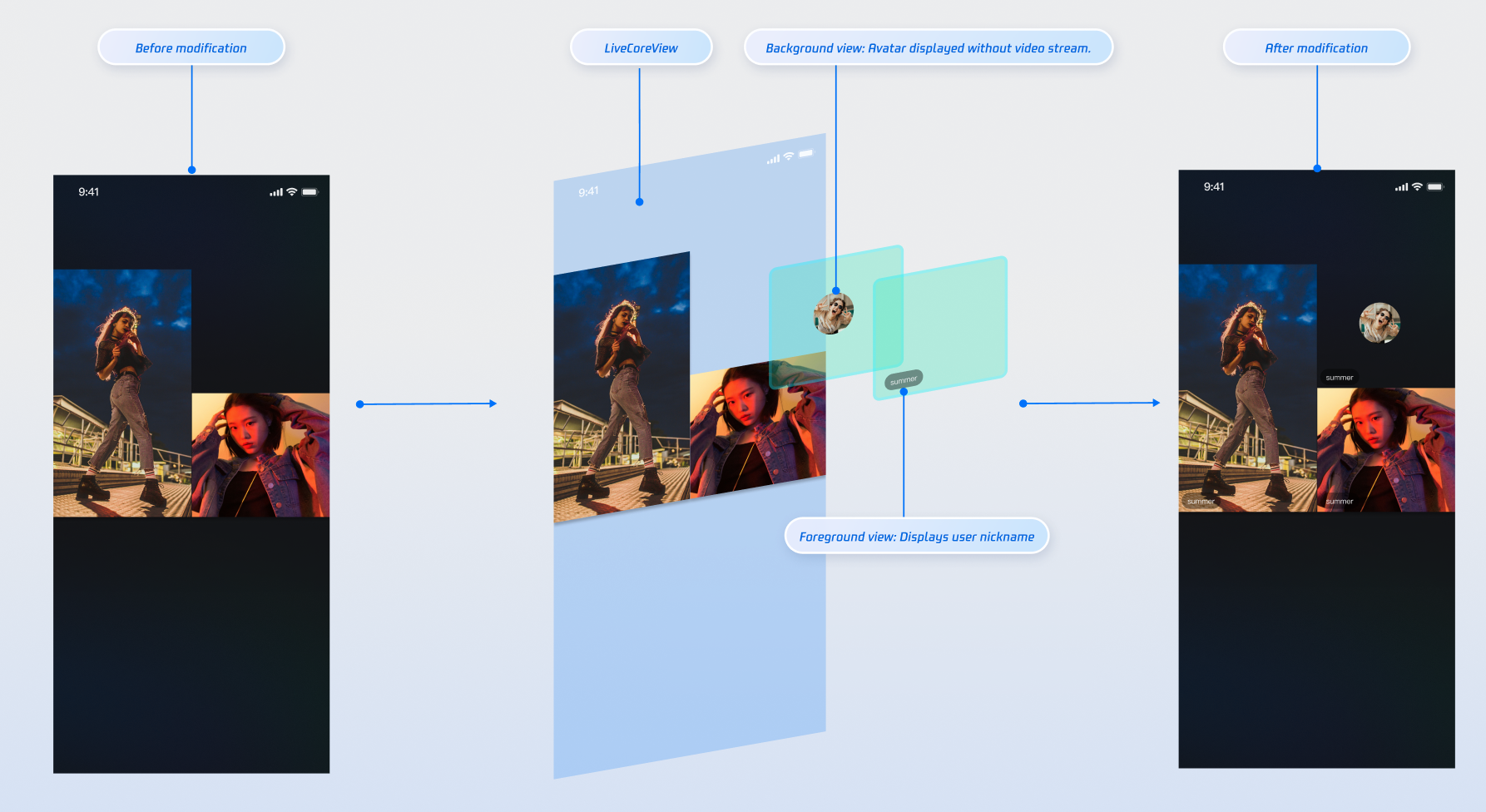 VideoViewAdapter interface to add custom views on top of audience co-hosting video streams. For example, display nicknames, avatars, or show a placeholder image when the camera is off to enhance the user experience.