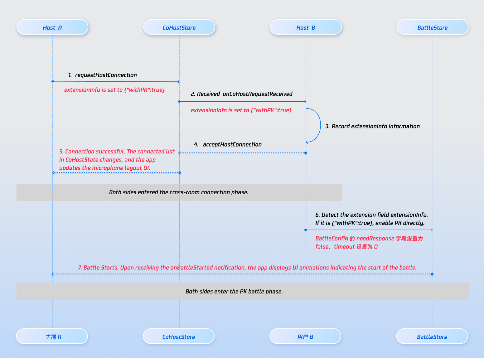 onBattleStarted event, render the PK progress bar in the UI.needResponse is false, PK starts automatically after sending the invitation.needResponse is true, PK starts only after all targets call acceptBattle.onUserJoinBattle.onBattleStarted.