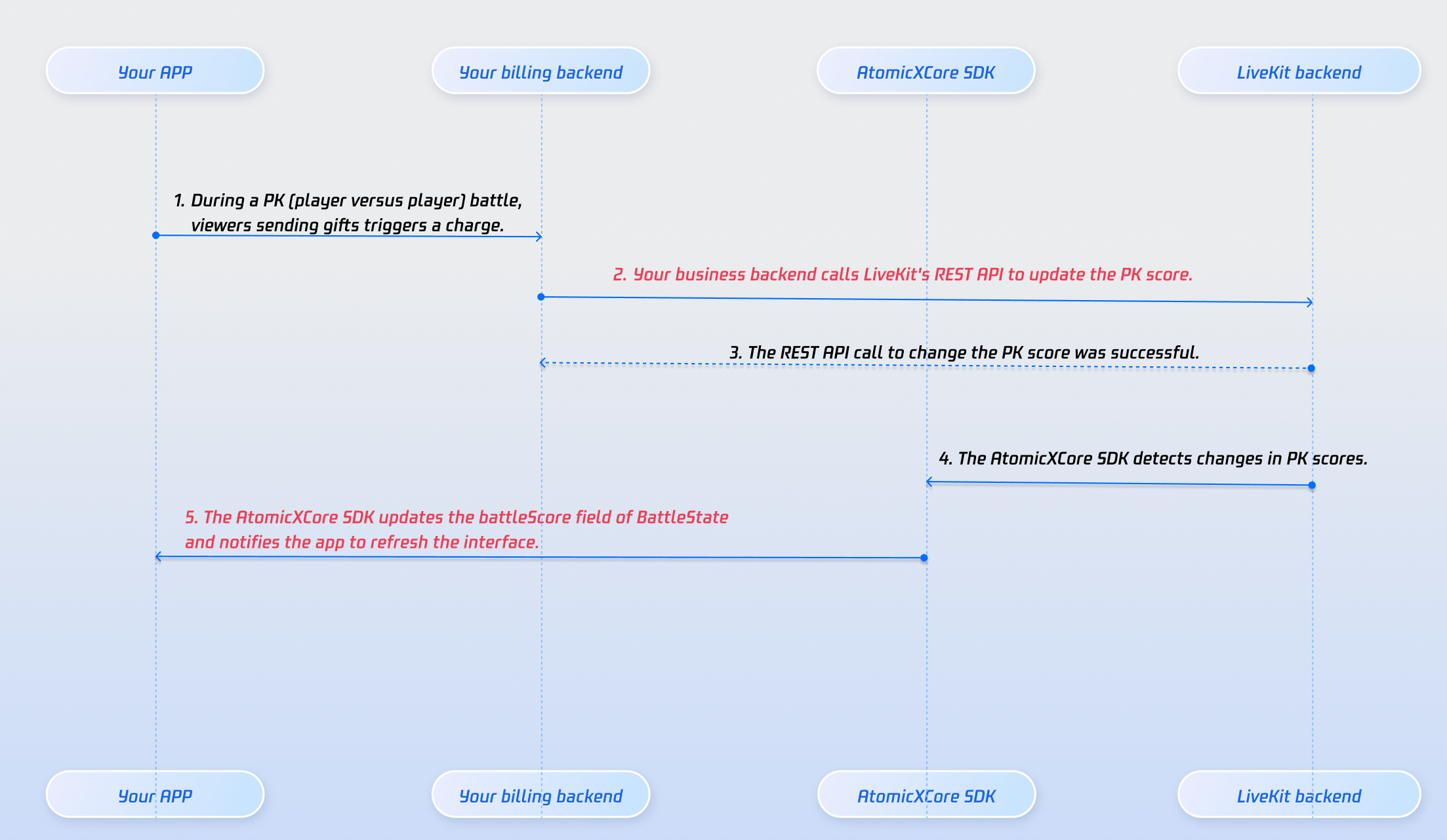 LiveKit backend actively notify your system when PK starts or ends.LiveKit backend.API | Function Description | Request Example |
