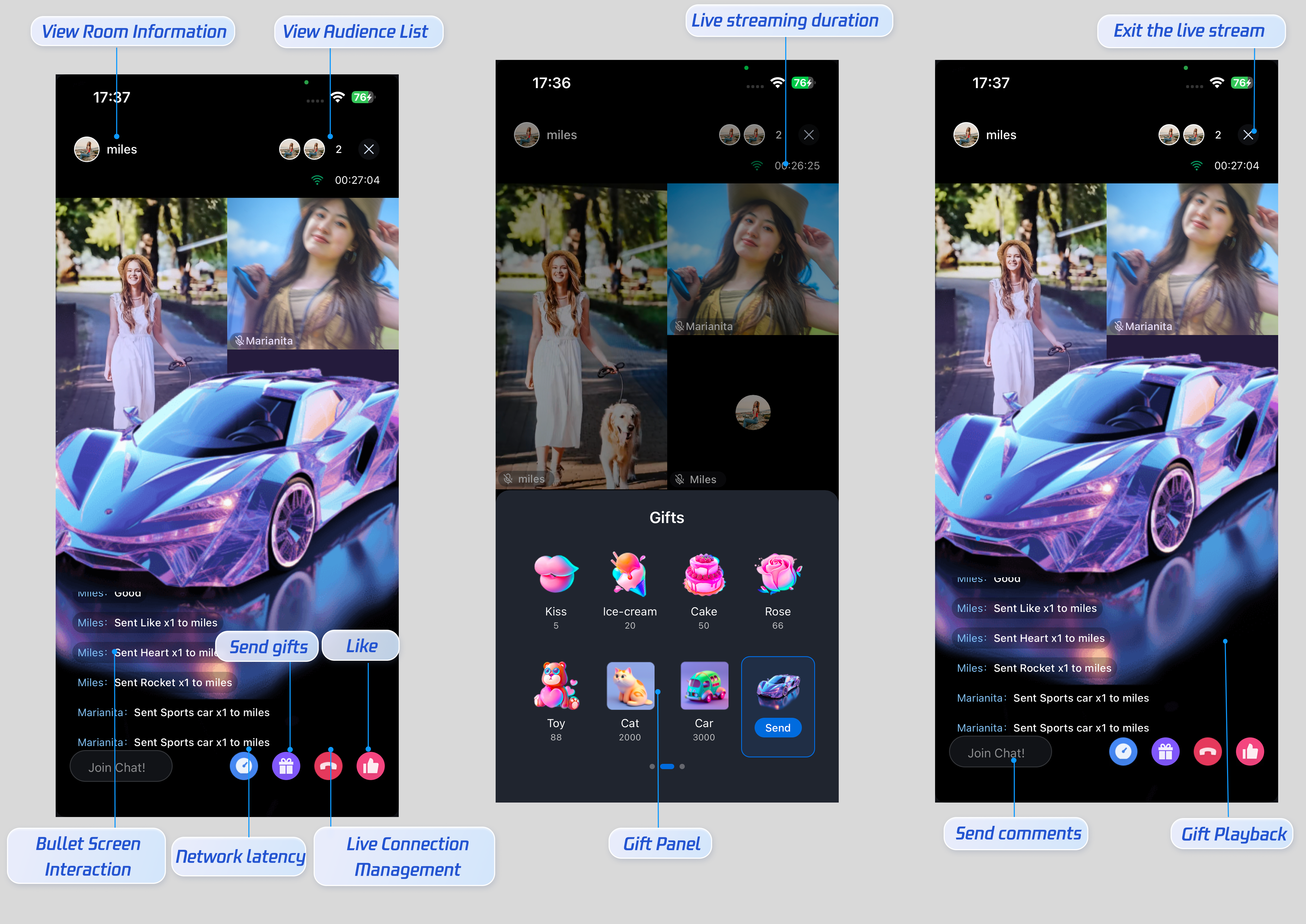 Live Stream List | Displays the Live Stream List interface and features, including list and room details |