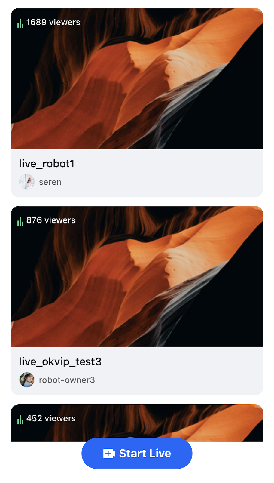 const CARD_WIDTH = (SCREEN_WIDTH - CONTAINER_PADDING * 2); // one per lineconst groupedLiveList = useMemo(() => {const groups: LiveInfoParam[][] = [];for (let i = 0; i < filteredLiveList.length; i += 1) { // change 2 to 1groups.push(filteredLiveList.slice(i, i + 1)); // change 2 to 1}return groups;}, [filteredLiveList]);